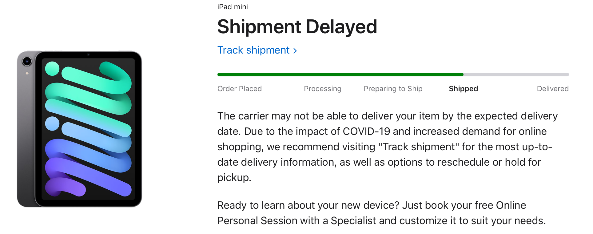 Hey, another Arkansan! Sorry about your delay, though 😢I ordered a Starlight, 64GB, WiFi Mini and a dark cherry case immediately after the event. It said delivery would be the 24th in Arkansas. It’s been sitting at preparing to ship since Monday. The Apple Store app still
