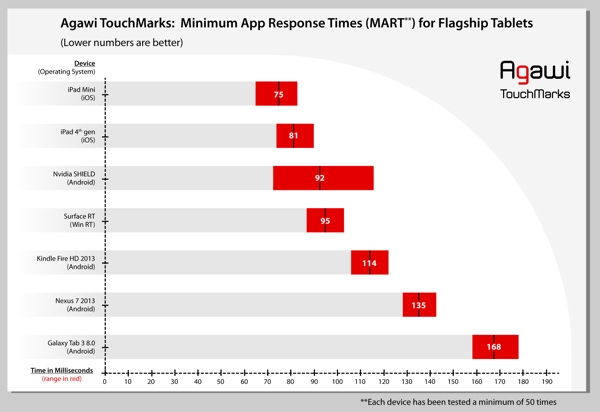 Previously, Agawi measured the response time of Apple's iPhone 5 compared to several other Android and Windows smartphones, with the iPhone 5 demonstrating a MART time of 55 milliseconds, which is significantly faster than even its own iPads.