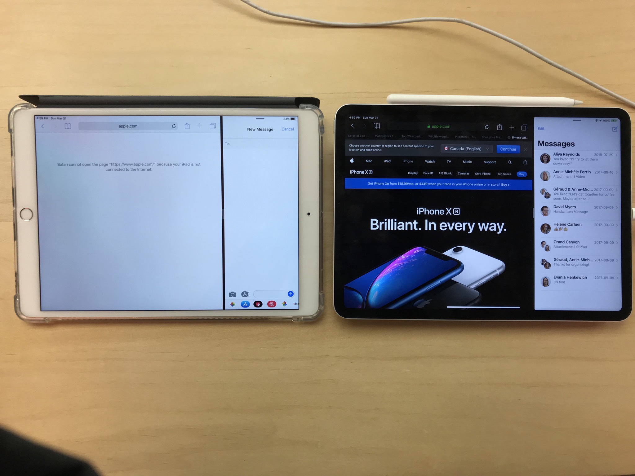 The biggest difference though (besides Face ID and lack of a home button) is just the width of the screen in landscape mode. While the 9.7" in Split View mode is quite awkward, it's very decent on the 10.5". However, on the 11", it's downright roomy in comparison. For example, take a look at the width of the Messages pane. Mind you, I might have preferred more pixels on the browser pane instead of the Messages pane though.