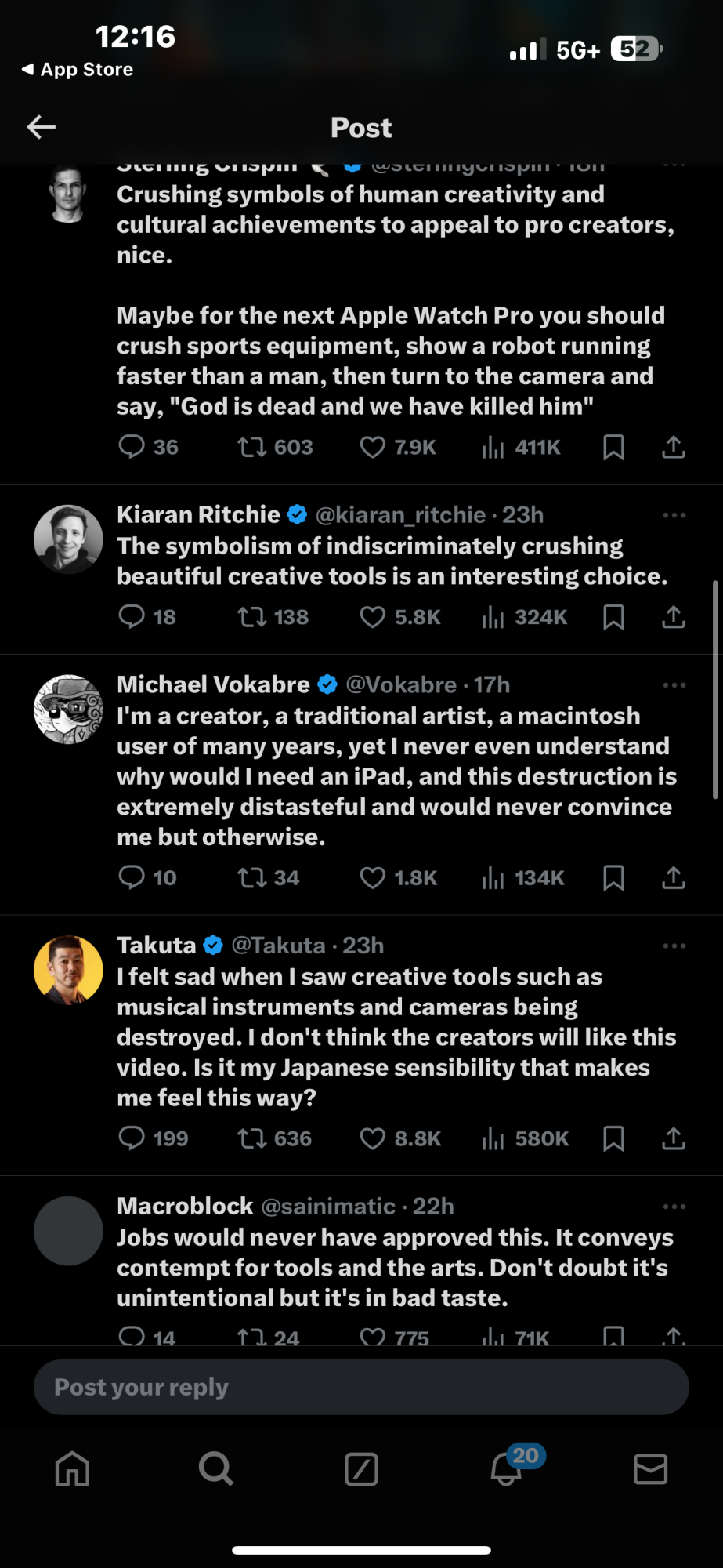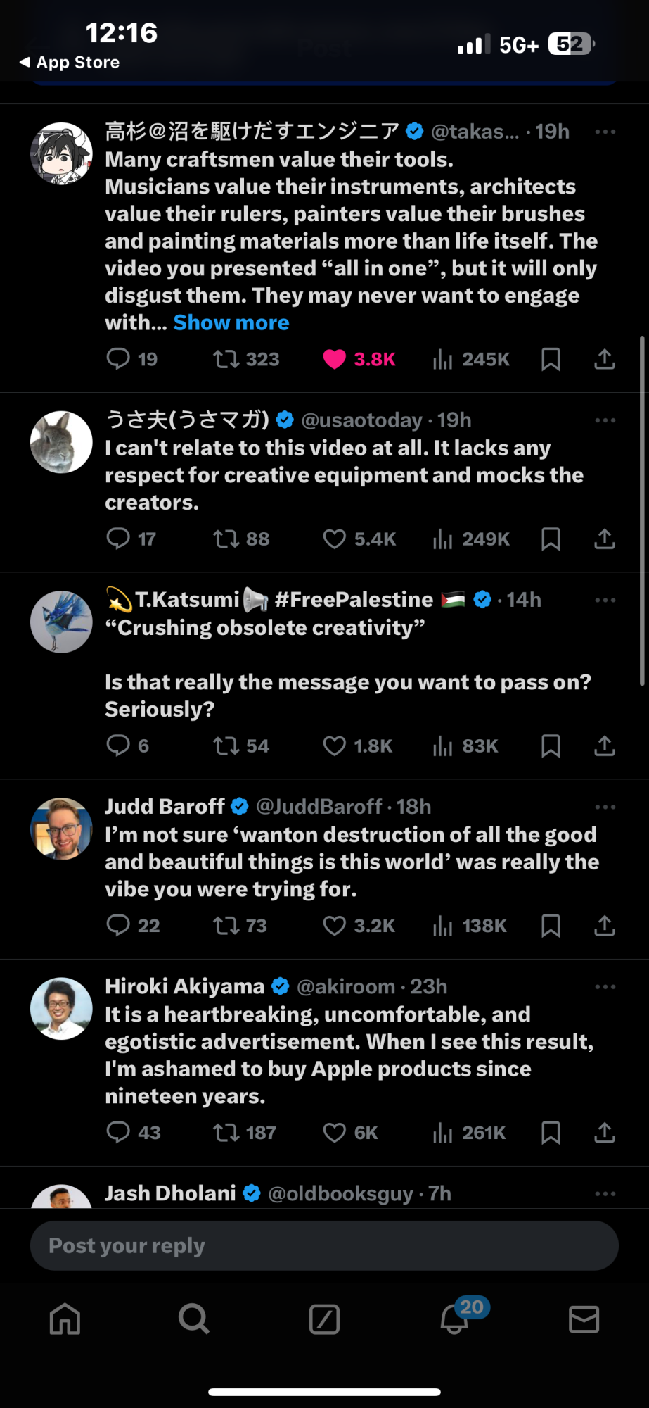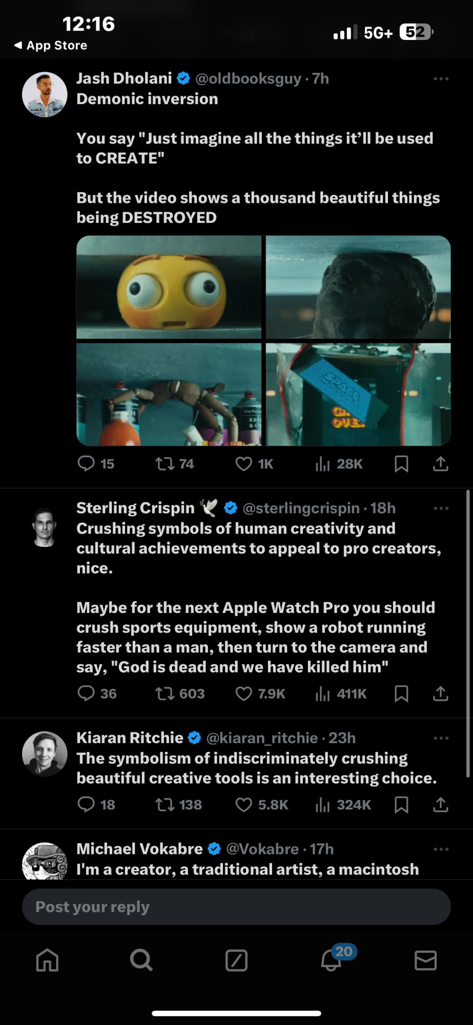 But nuance in how an idea is expressed matters. the gratuitous shots of these items being destroyed, however they were achieved, do communicate a certain disrespect to the tools and disciplines you’d think they’d want to be showing in a more reverential light, given the audience they’re targeting. And as mentioned, it also feels weird for a company that touts sustainability to visualize it this way. Lastly, just from a super literal read, I kinda laughed when I saw it because I was like “oh, so apple’s saying the iPad contains a bunch of broken stuff?”