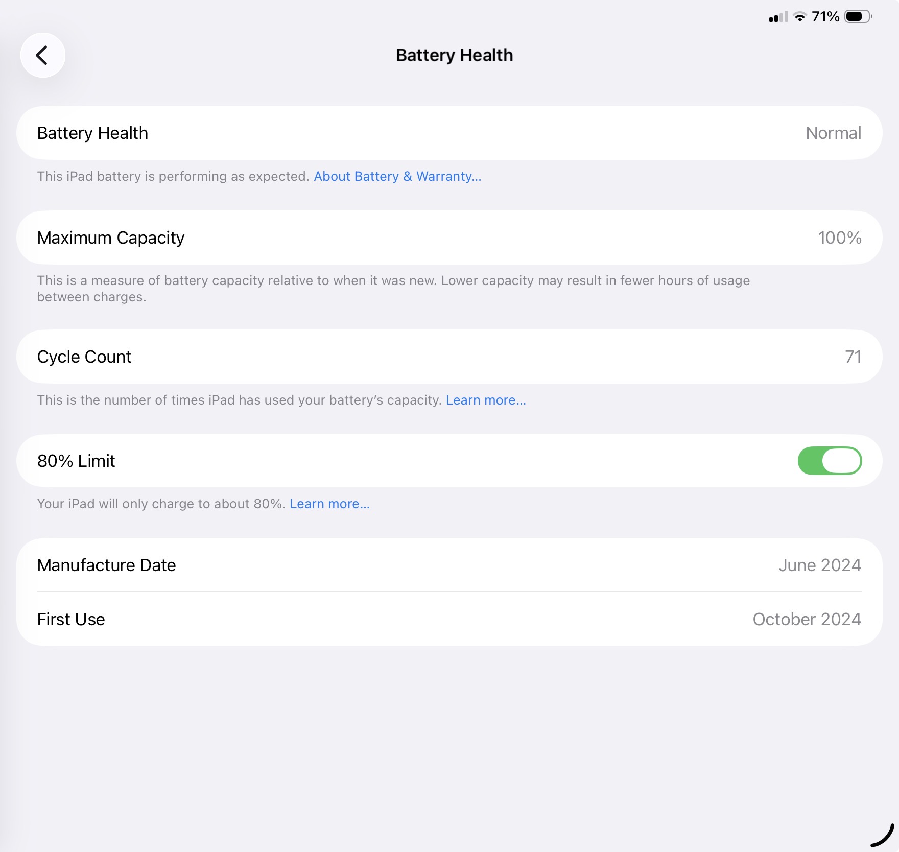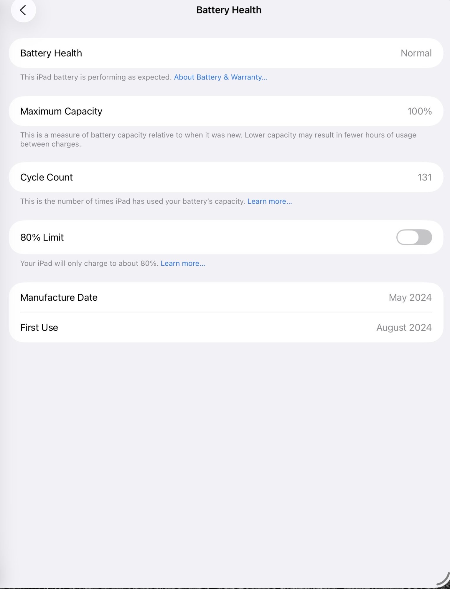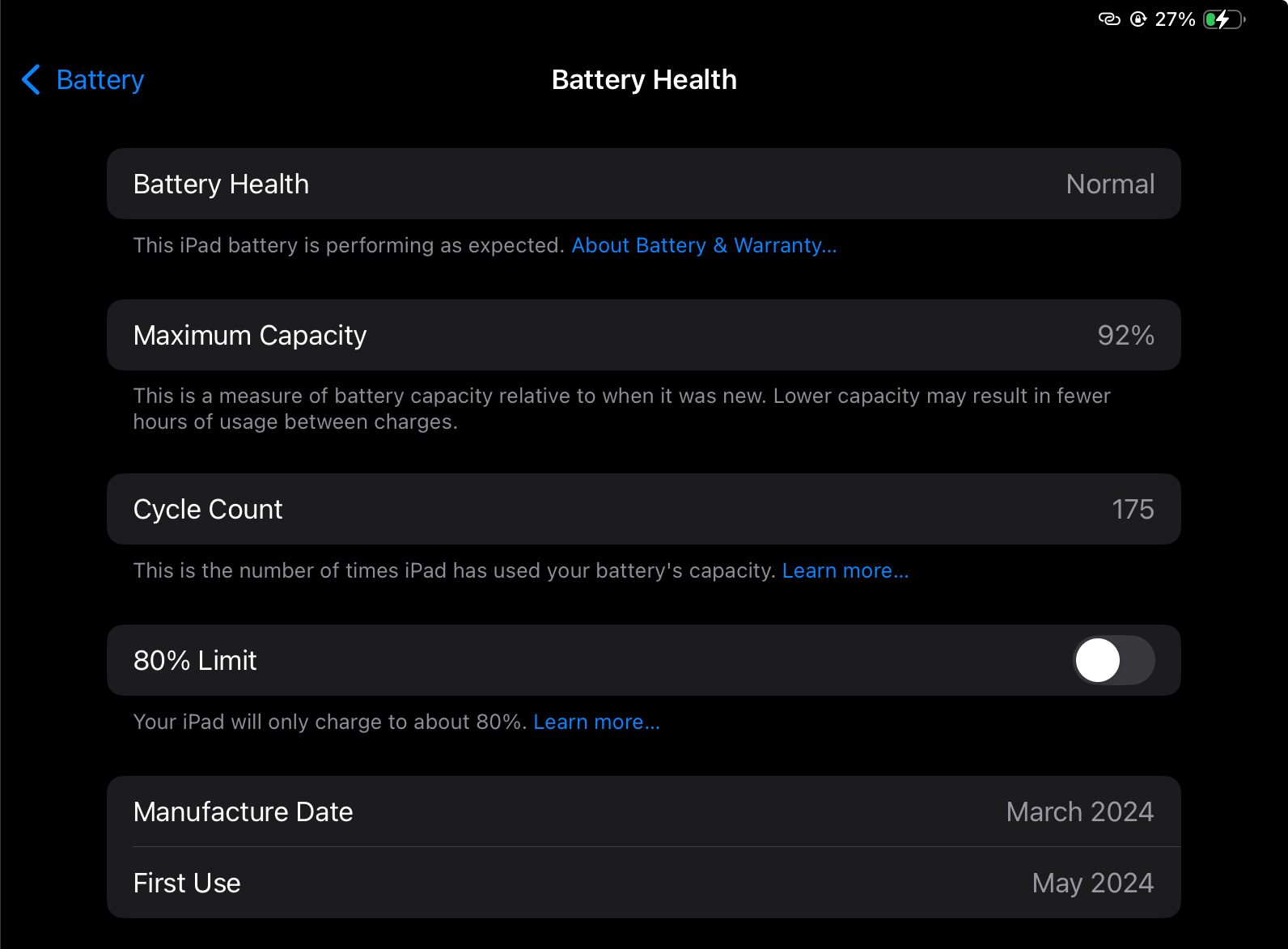 Here’s mine. I’ve mostly kept it on the 80% limit because my iPads are inconsistently used. I typically only set it to fully charge when I know I have plans that will involve me taking it out of the house.