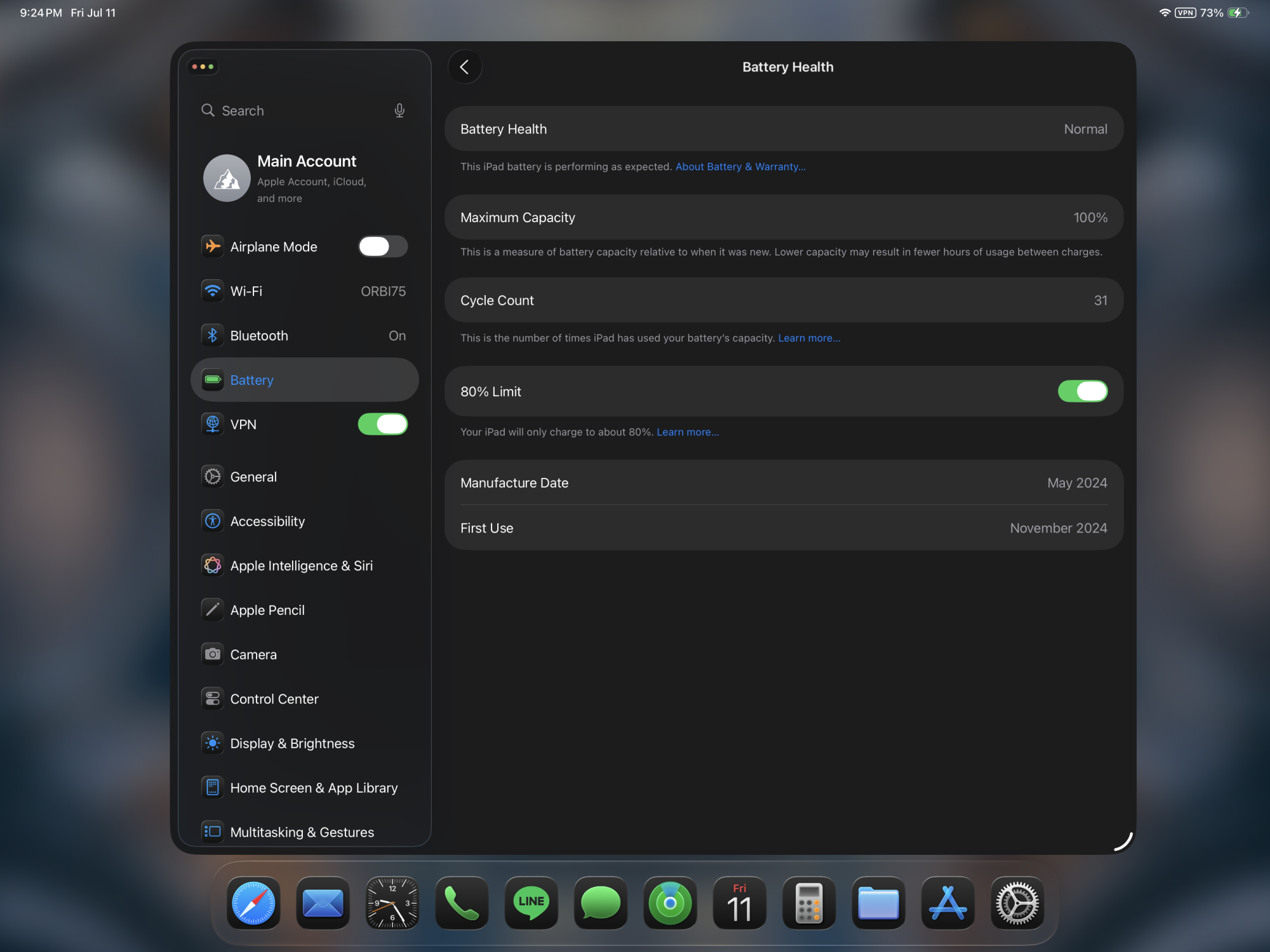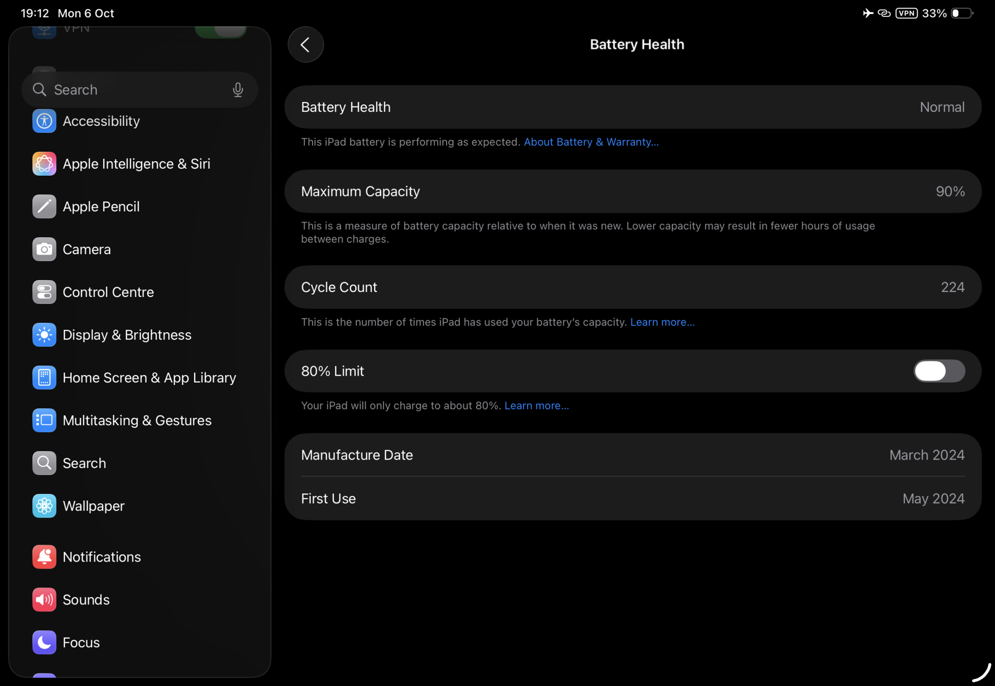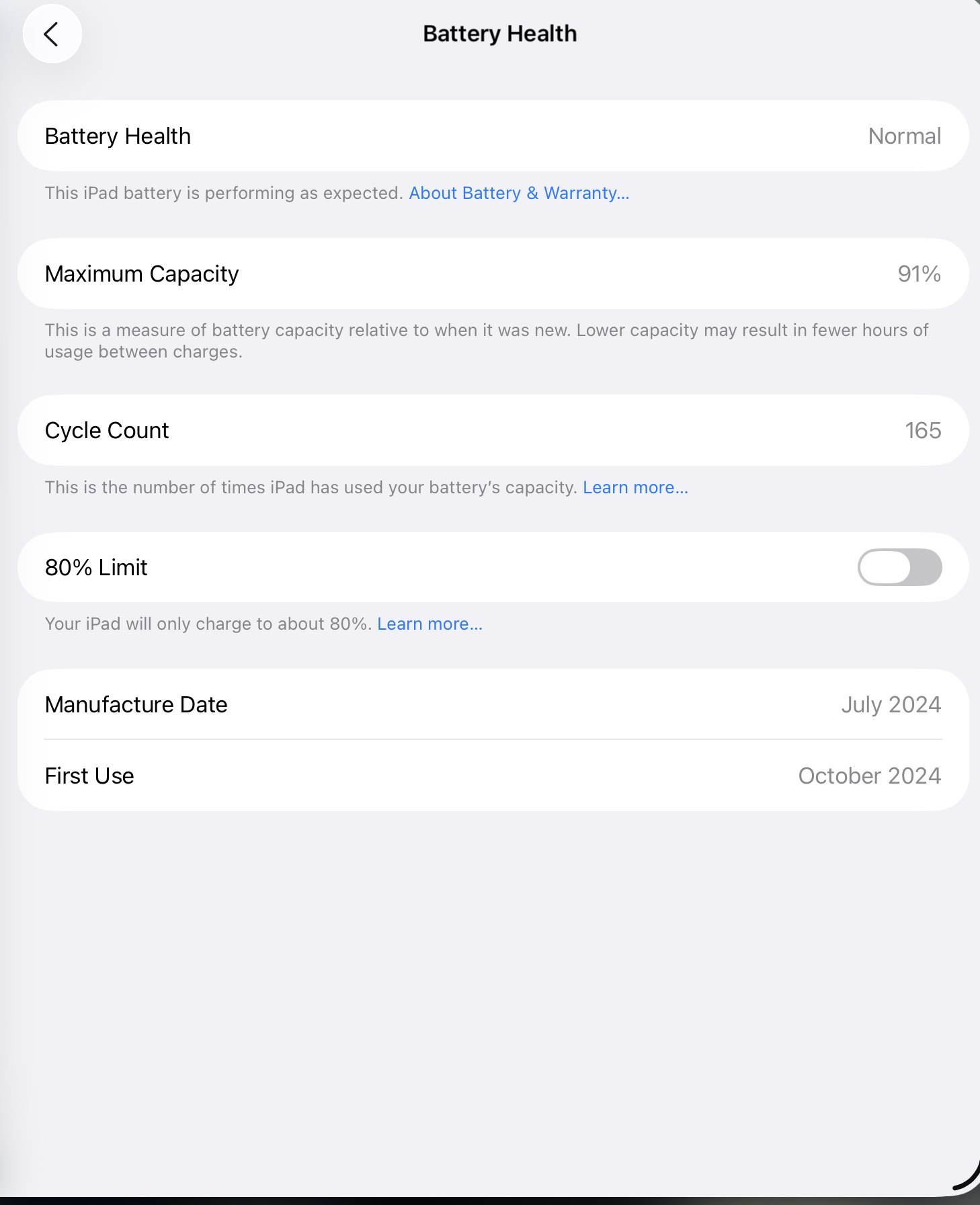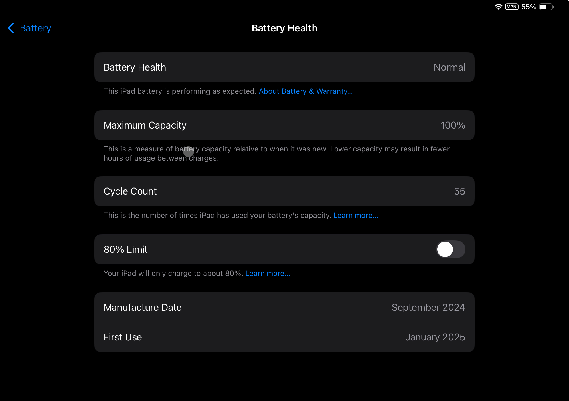 Here’s mine. I’ve mostly kept it on the 80% limit because my iPads are inconsistently used. I typically only set it to fully charge when I know I have plans that will involve me taking it out of the house.