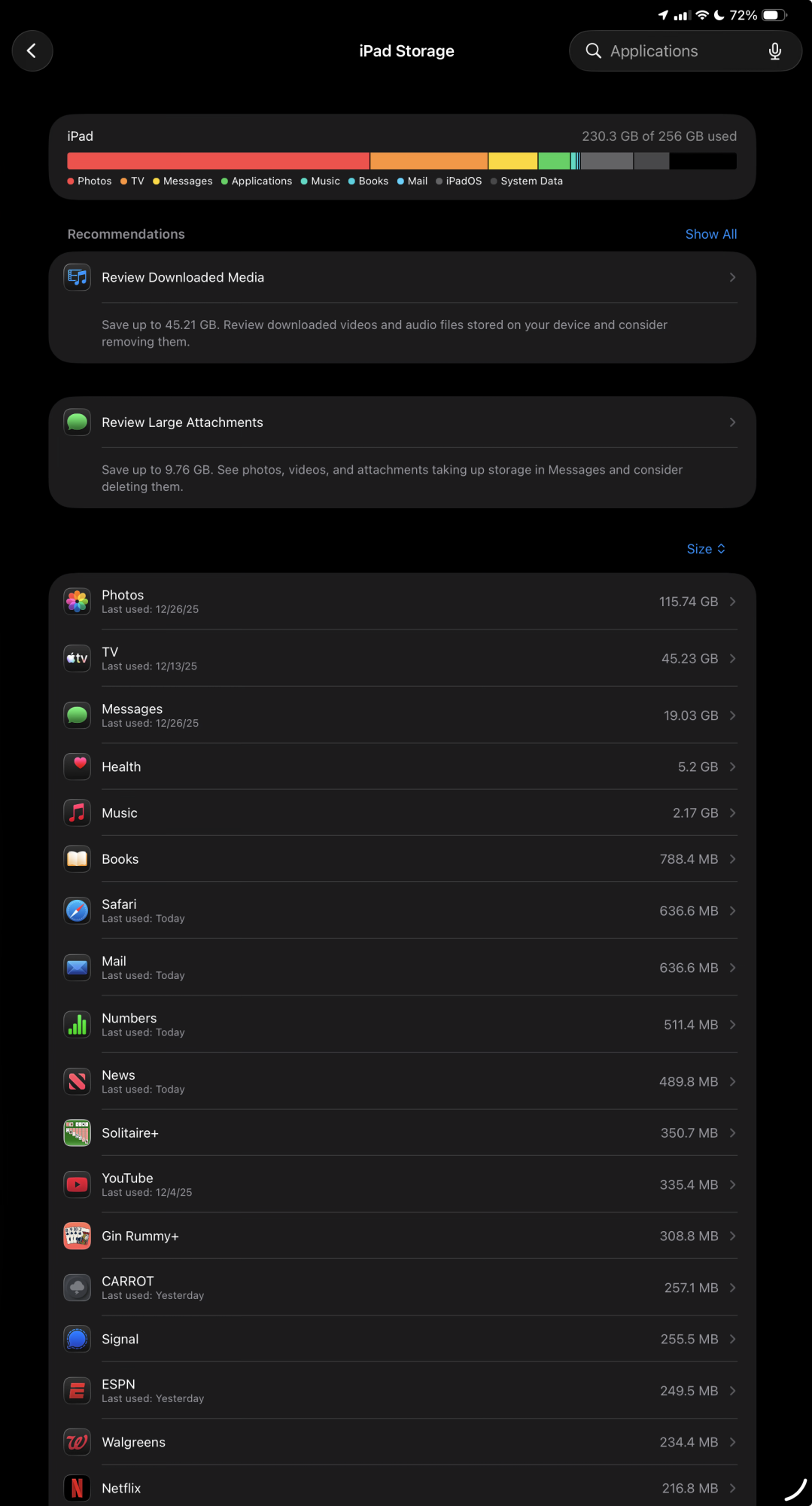 This demonstrates how different people will come to different conclusions from the same data. If i was using that much of the internal storage, i would conclude that I should have gone with the next higher storage option.Similar use case here and256 is plenty for me plus I keep ~100GB of photos locally