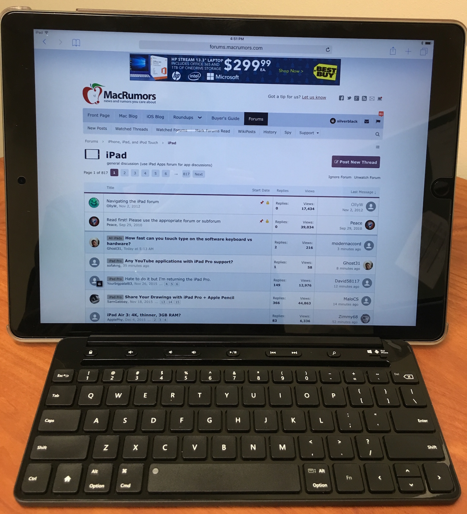Then for some reason curiosity just got the best of me so I picked one up while I was at the mall and brought it home. Upon taking it out of the box there's that initial shock of "holy crap this thing is big". But that feeling went away after just a few minutes of playing with it because really, the only reason we think "holy crap this thing is big" is because we think in terms of comparisons. The last device I used was an air 2, so I compared it to that. Had my last device been my 15inch retina MacBook, it would feel extremely portable. Perspective changes. After I got used to it and then picked up my iPad Air 2, the air 2 felt like a toy in comparison. It sounds funny, but I felt like I couldn't even see anything on the air because the screen was so small. It's like getting used to big screen tv's and then going down to a crappy standard def 13 inch tv. You've gotten used to a nicer viewing experience and you don't want to settle for any less. Have you seen the screen on an iPhone 4 lately? Did you feel that shock of "oh wow. I can't remember I used something so small for all of my needs"? Me too. That's the feeling I get with the air 2 now. So I sold my air 2 and my pro is my go to device.