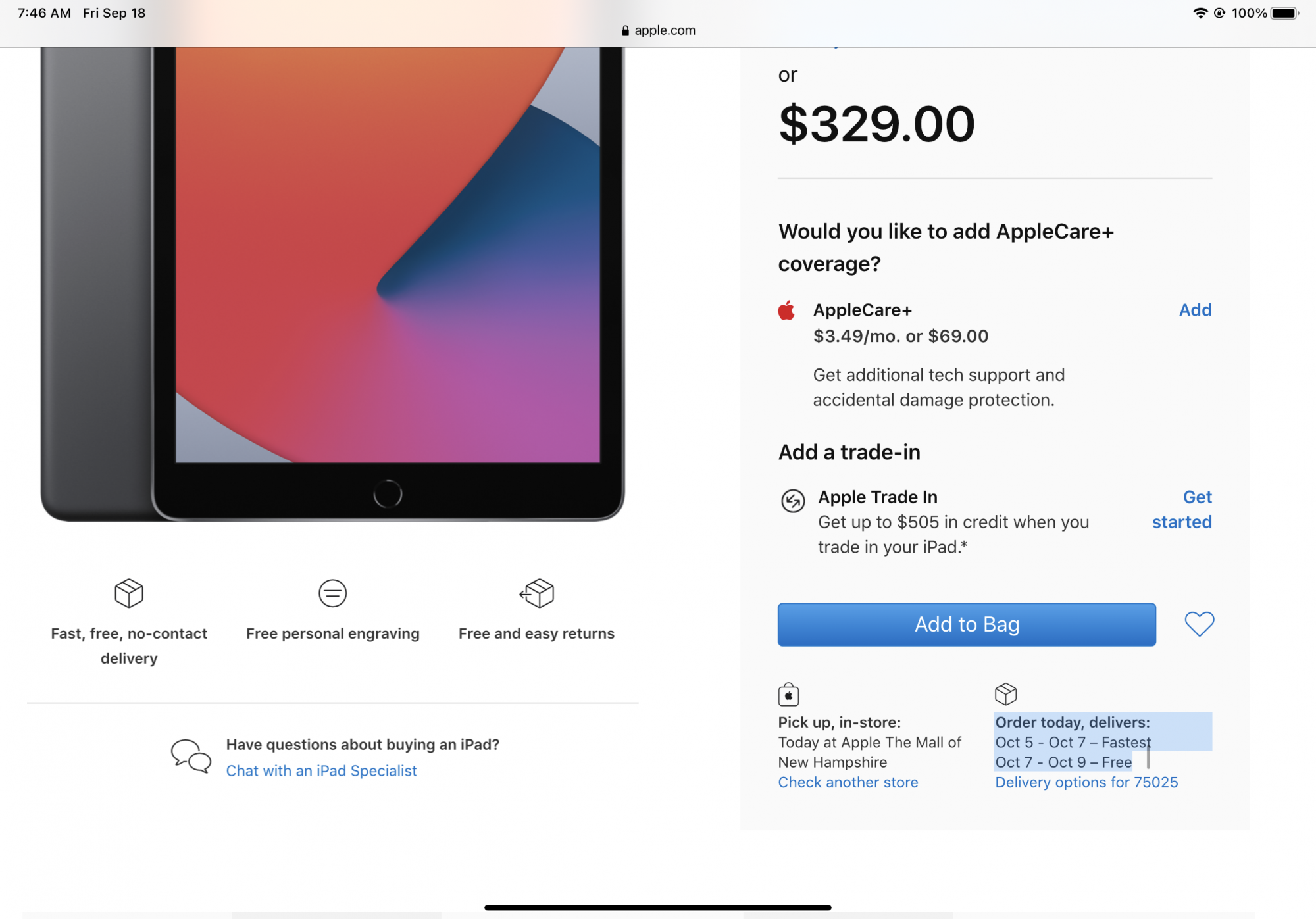 August 13: Ordered an IPP 11", 128gb, space gray, no engraving, wifi only iPad (free AirPods w/ Edu discount) through Apple