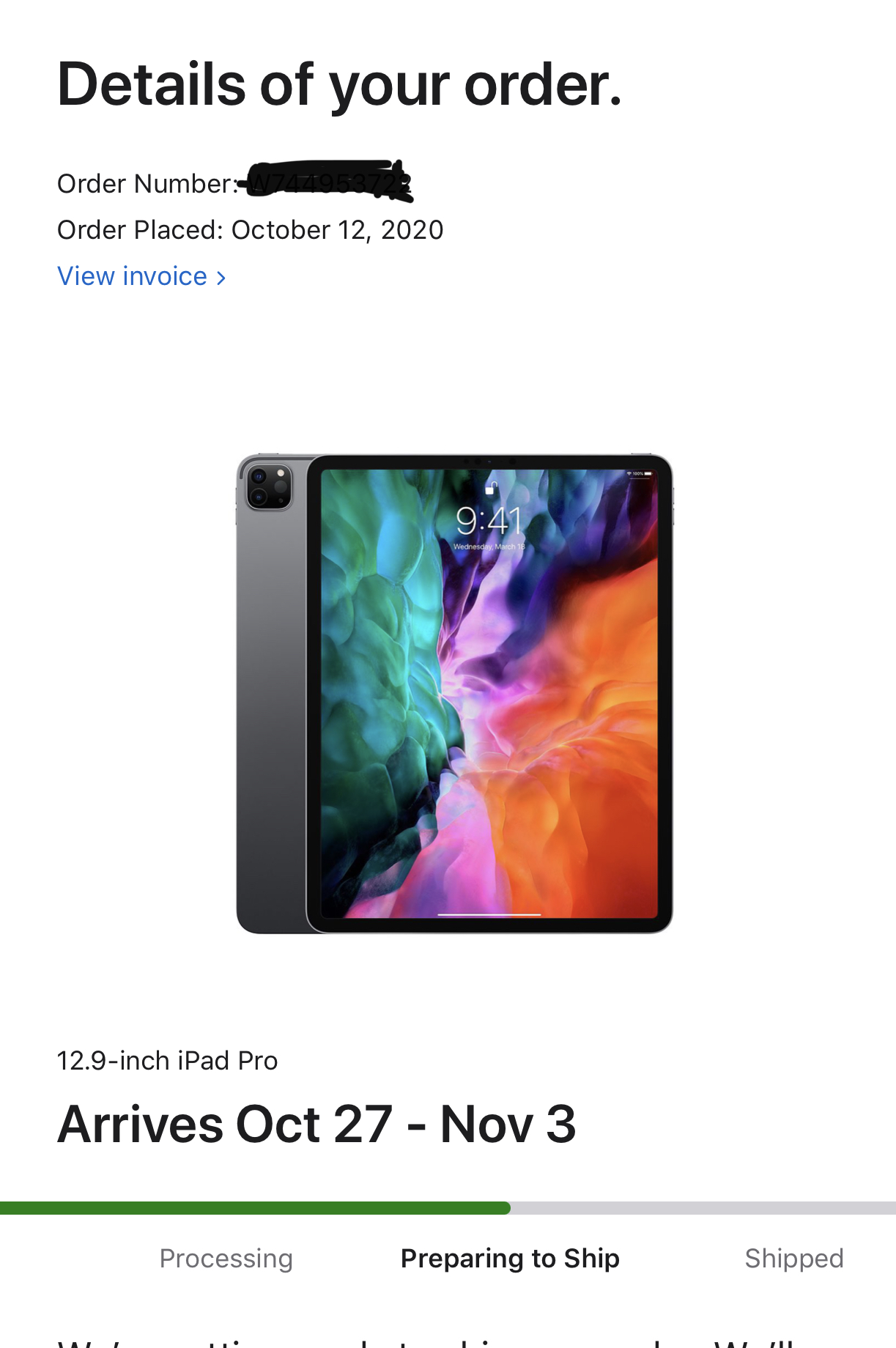 I ordered my 11 inch 128gb 10/07 and it's not doing anything.. Hopefully, you have it early next weekView attachment 976378
