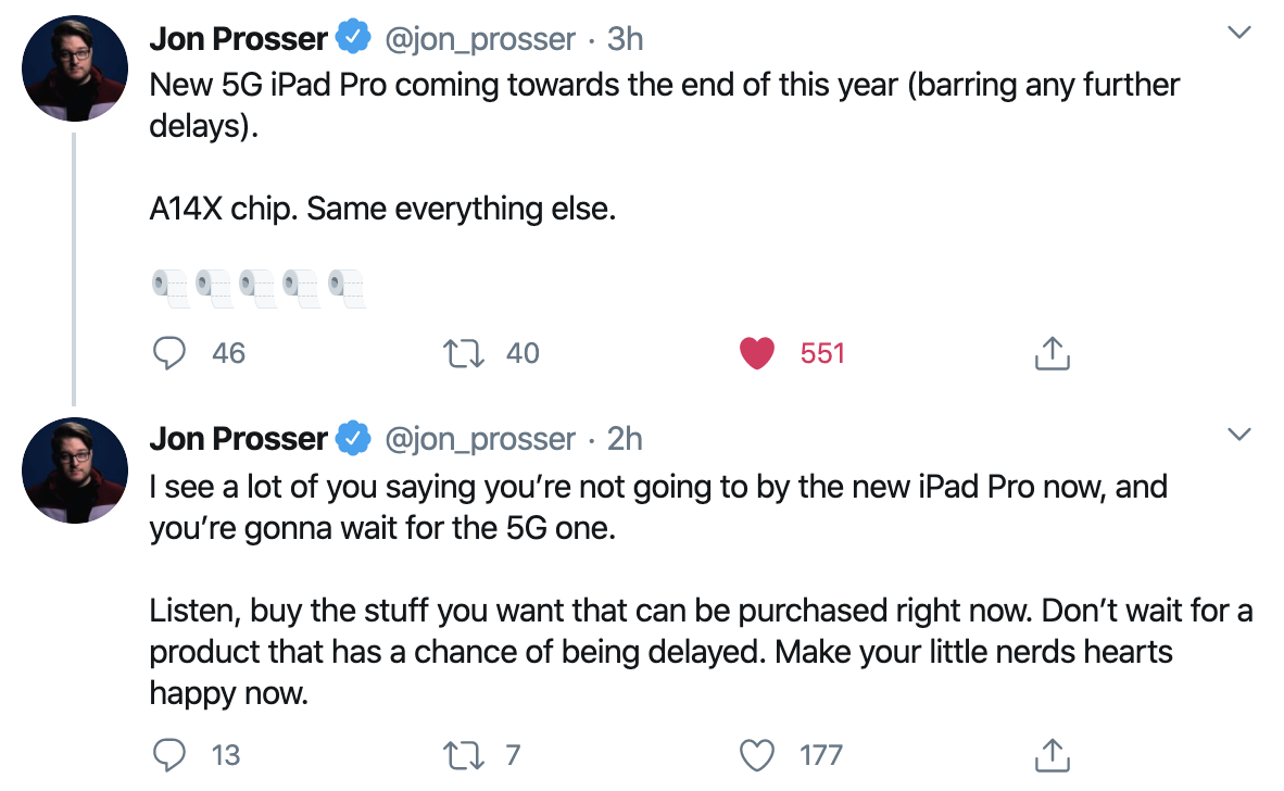 So Jon Prosser, from FPT, reports that a 5G-only version of the iPad Pro will be available at the end of the year. Note that the wifi-only version won't be upgraded... Also, the micro-LED version of the Pro will be launching by 2021... What do you think?