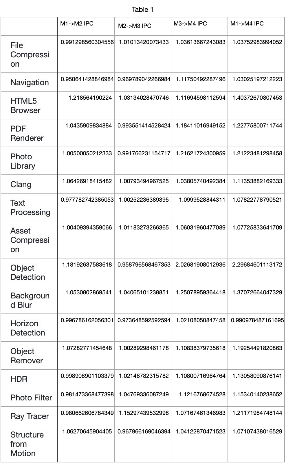 Because I though it would be fun I chose a GB 6.3 result from each processor (so run-to-run variation comes into play I'm not trying to get exact numbers from averages) and compare the change with clock speed. Given my results I can say that it's more than that but far more importantly, it depends strongly on the workload. For instance since the M1 (again give or take run to run variation and me rounding), IPC for GB's HTML 5 and Background Blur tests have increased roughly 40%, IPC for PDF Render and Photo Library and Object Remover and Ray Tracer have increased ~20%, IPC for Clang, HDR, Photo filter by 11-15%. IPC Text Processing, Asset Compression, Structure from motion, are about 7%, File Compression and Navigation are about 3-4%, while Horizon Detection is completely flat. Object Detection prior to SME went up by 18% between the M1 and M2 but was flat between the M2 and M3. Obviously unknown what it would've done in the M4 without SME. Now if you want you could create "an average" of those by taking the geometric mean for FP and INT tests and weighted arithmetic mean over the two but that would conceal everything that's interesting and why I don't like averages. This shows in fact Apple that is iterating quite strongly in areas they care about for the CPU's performance and they are leaving to clock speed those that they don't. The average is brought down by the latter. I would argue rather than the criticism that Apple "studies for the test" it would appear that they have their own design priorities for what's most important to improve for their users and those are different from GB's. Table attached below. Unfortunately I can't share the full spreadsheet so it could be checked for errors, but I think it's right.