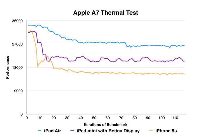 Being the largest device (and the only device with a metal heat spreader and no DRAM stacked on top), the iPad Air obviously maintains the highest frequencies for the duration of the test. The iPhone 5S, with a significant reduction in internal volume (and a PoP SoC) reduces its CPU frequencies early on in order to keep skin temperature down and properly manage thermals. The iPad mini with Retina Display falls between the two, with its performance curve more closely following that of the iPhone 5S.