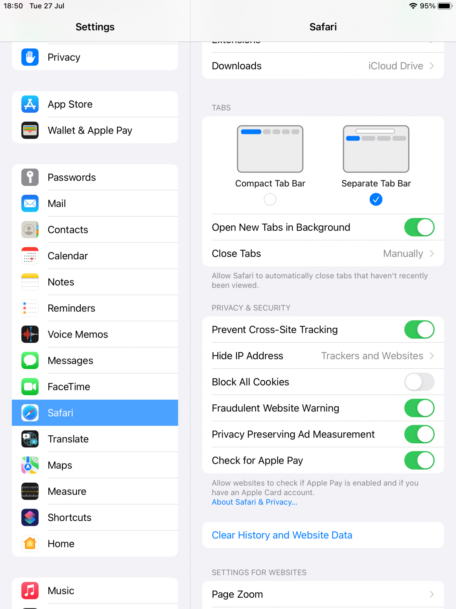 While the separate tab bar is enabled automatically when updating, in the Safari section of Settings, there is an option to toggle on the original compact tab bar that merged everything together.