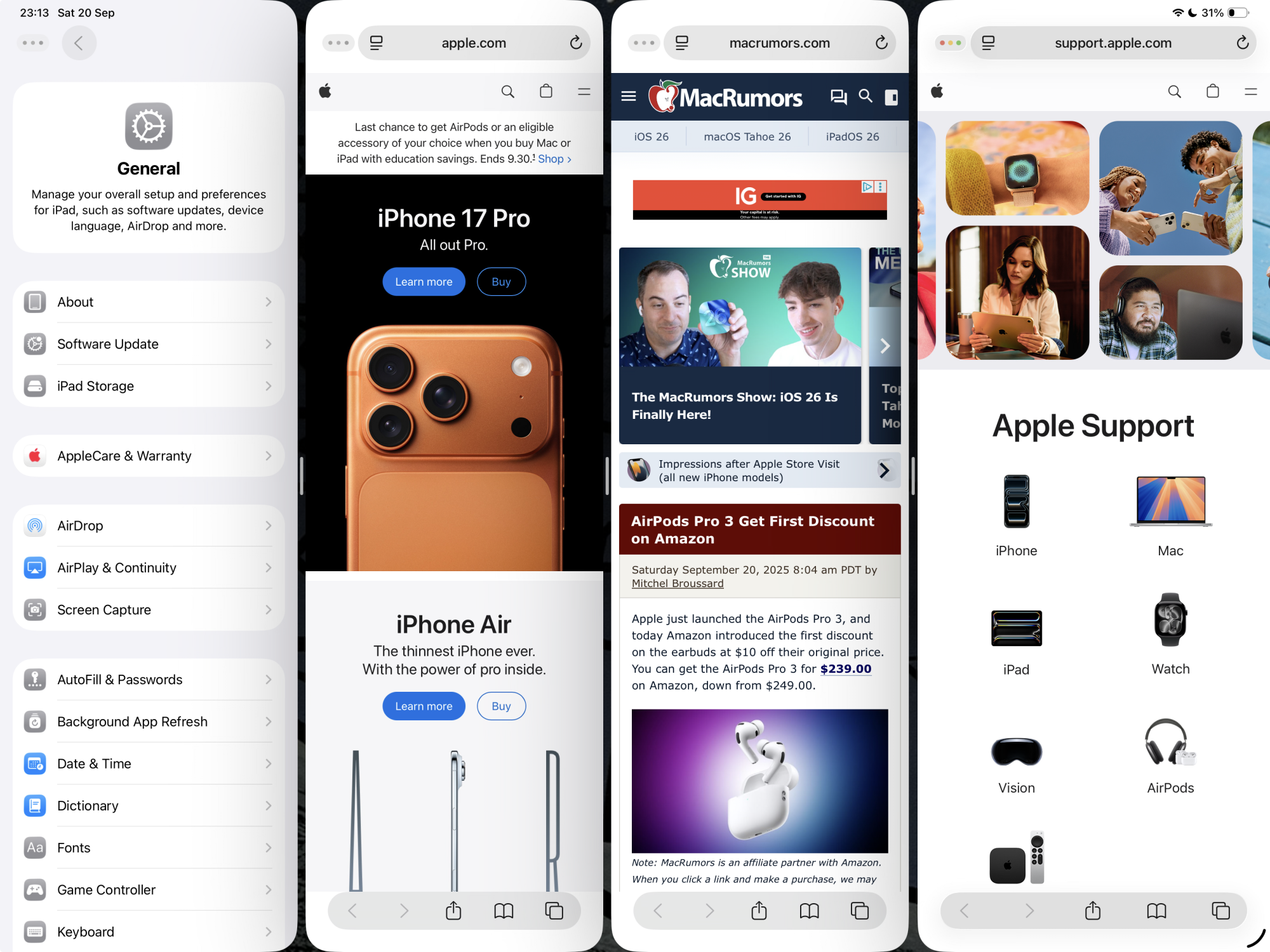On 13-inch iPad, you can manually split the display between even more windows. Notice the handles between each pair.
