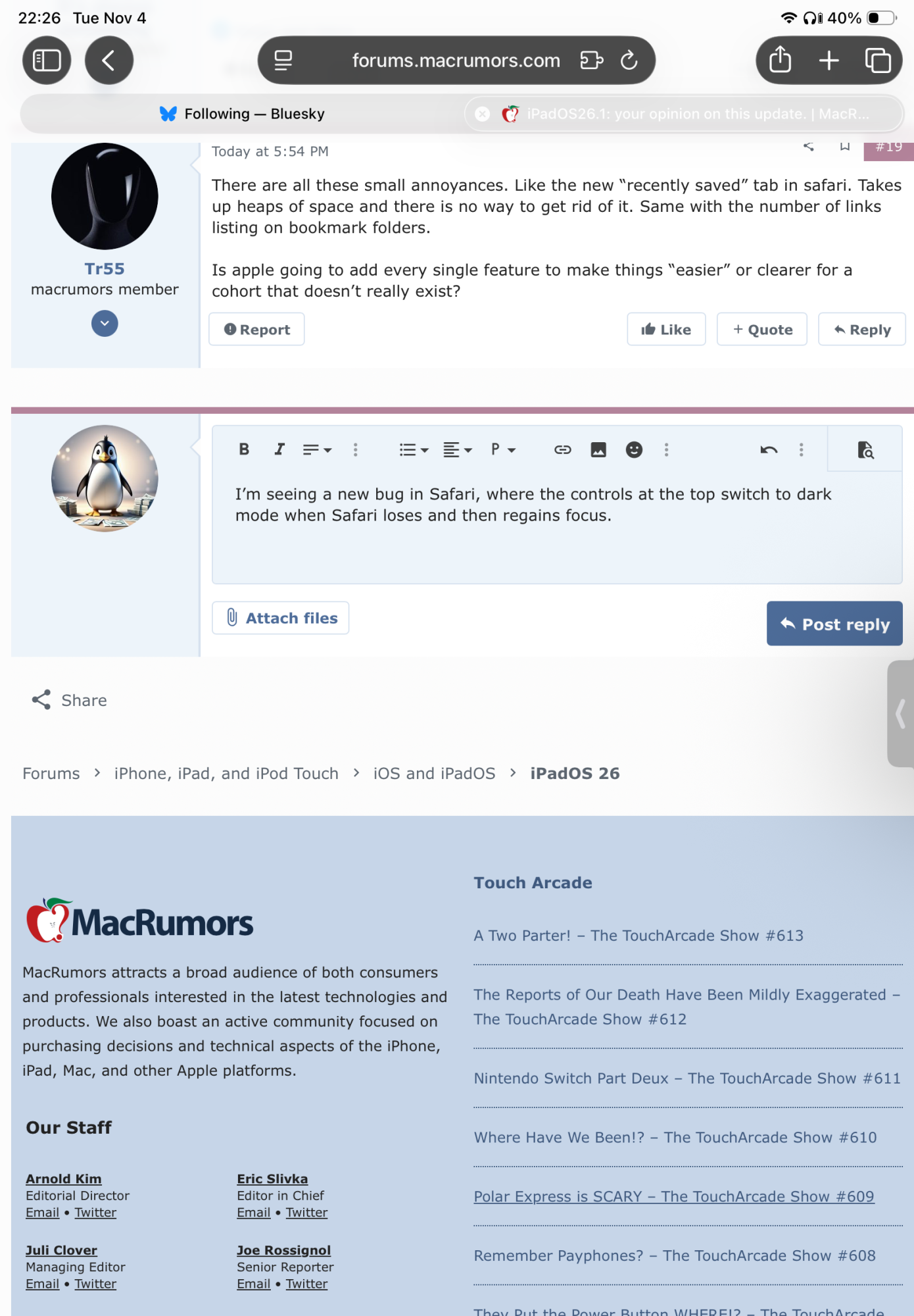 This exact reaction has been ubiquitous here and elsewhere. The multitasking emulates MacOS but not quite and it kills touch-first multitasking. It’s sad that Apple listens to the minority that wants this.There's actually a good reason I updated - i was sorta hyped about the multitasking features, but that's actually turned out to be a wash because the new multitasking makes the iPad actually quite touch unfriendly in the end. Definitely needs work.