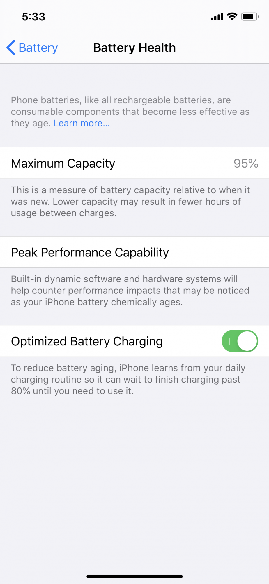 I’m also using the wireless charger of Samsung and my iPhone XS, which I bought in november 2018, had 100% till a week ago. Now it’s at 97%.I am using the Samsung Wireless charger (as Apple failed to make one), my phone still has 100% battery health.