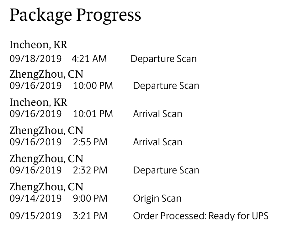 This is exactly what my husbands tracking looks like... :/ I only have a 4:01 origin scan in ZZ. That’s itWhat in the world is going on? Still no updates from UPS! Anyone stuck and still on the same page?