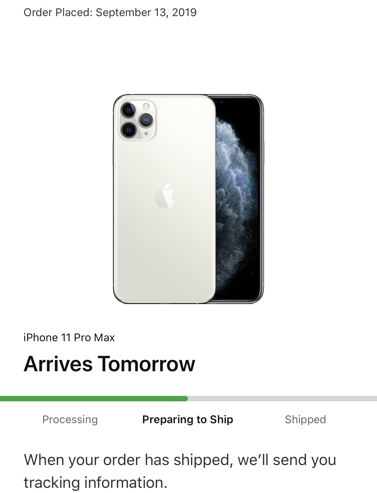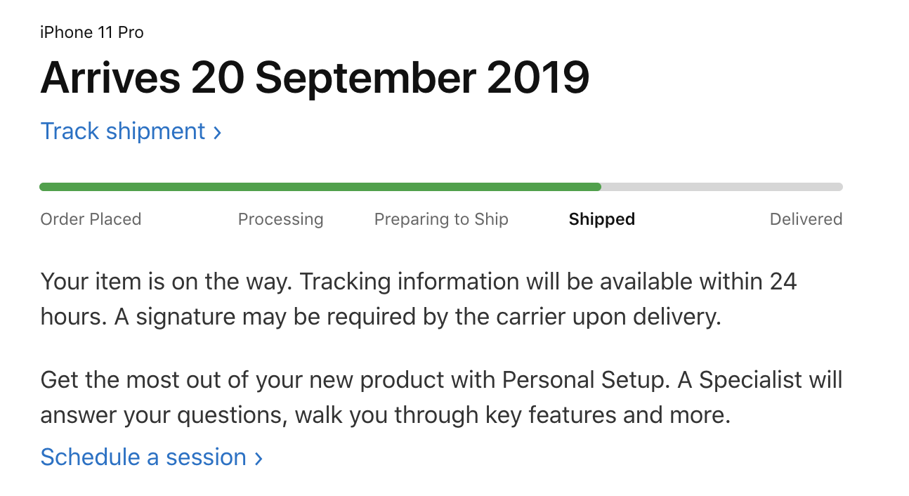 Apple Store: Good news! Items in order Wxxxxx have shipped and will deliver by 20/09/2019.