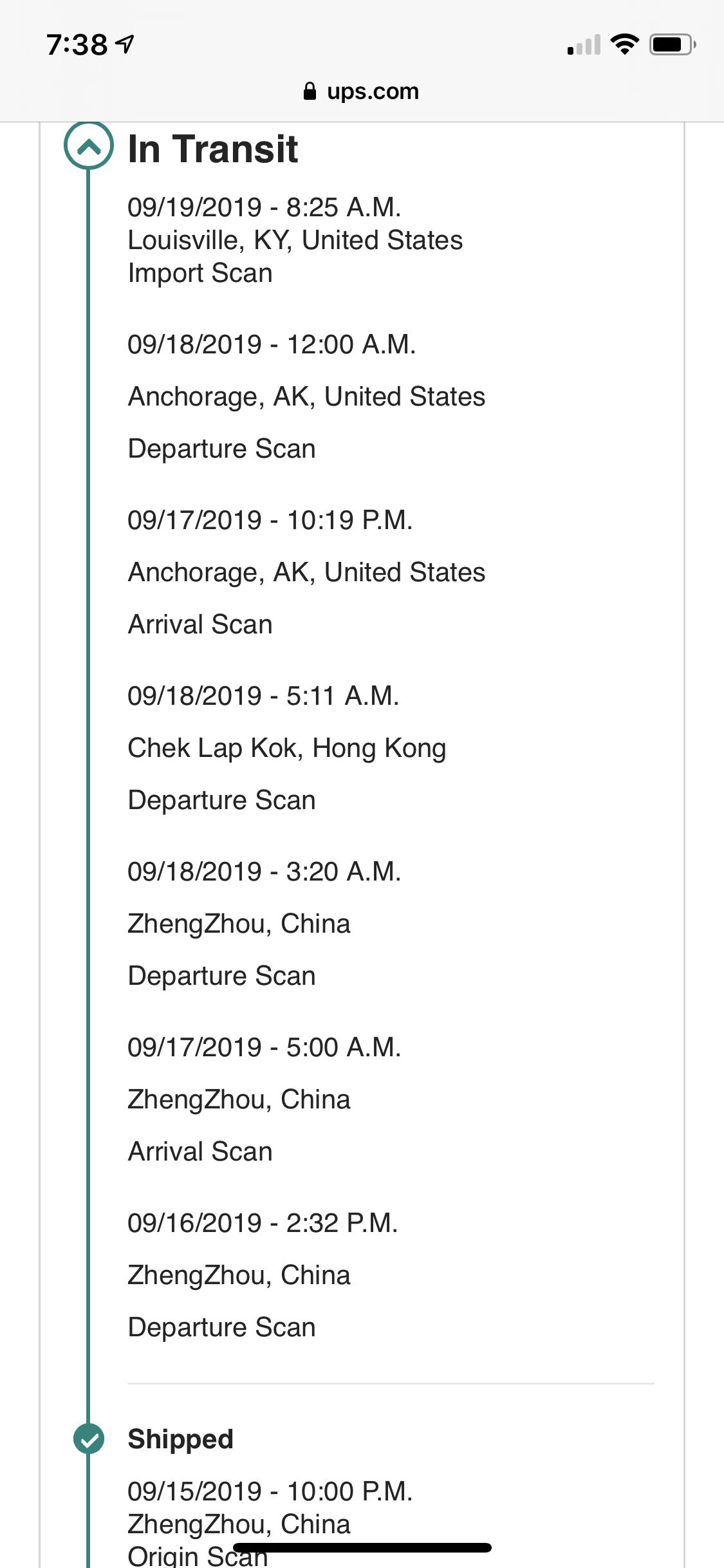 I'm guessing your phone is actually in Kentucky. The system appears to not be updating properly for a number of us.Received notification that my iP11 Pro is shipped but still sitting in China. 🤷🏽♂️