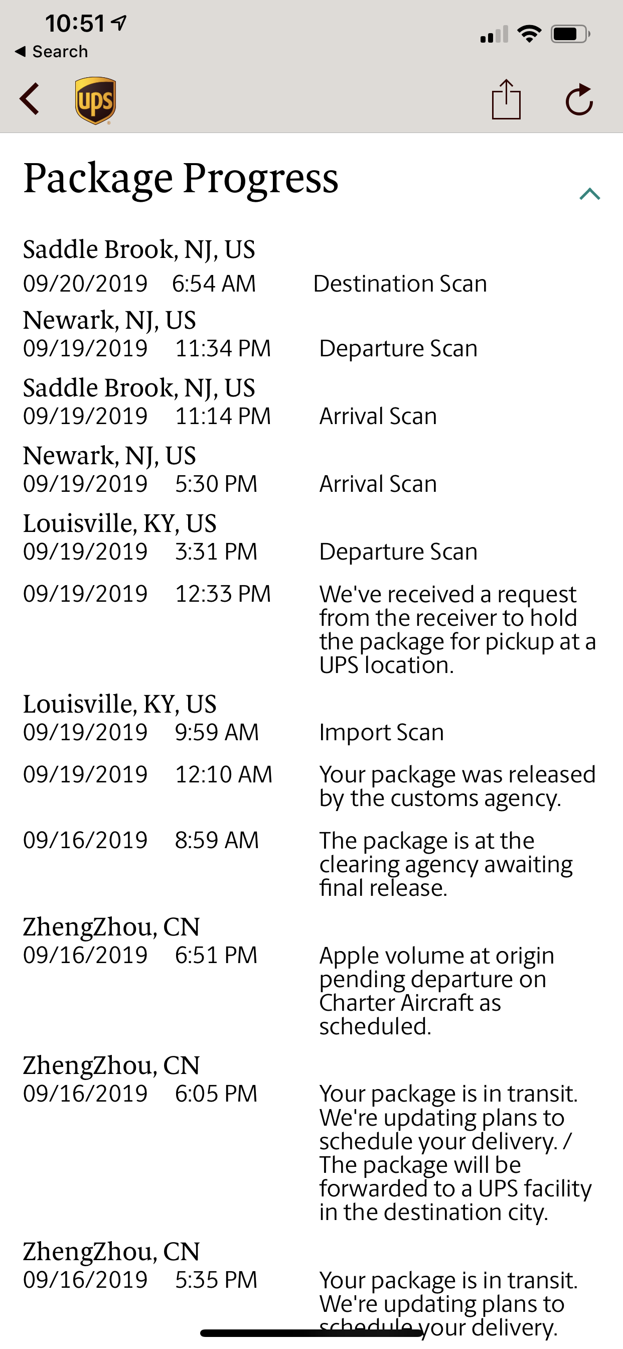 holding at cc always add an extra wrinkle where things can go bad. I never do it . Always deliver to work or home if you can.UPS does not know where my phone is. Went to the CC as I had requested it to be held. Never got the ready for pickup scan. Only the destination scan this morning. CC people were super nice and tried calling supervisors but the last “physical” scan they see was yesterday in Kentucky. They say all the rest of the scans are “virtual” scans and that my phone never made it to Newark or to the CC despite what I see as arrives, departure and destination scans.... Did not know about “virtual” scans vs. “physical”. So I left empty handed and now I’m on hold with UPS customer service. They said it will probably turn up somewhere today and make it back to the CC tonight or in the morning (but holding for CC pickup means I won’t be able to get it until Monday at the earliest). Frustrating but - oh well - first world problem for sure.