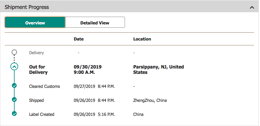 | 09/27/2019 4:04 P.M. | ZhengZhou, China | Your package is in transit. We're updating plans to schedule your delivery. | ||