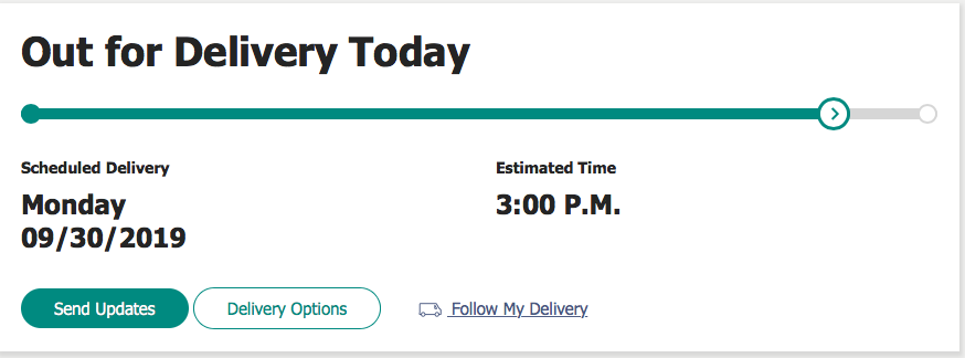 | 09/28/2019 5:11 A.M. | Louisville, KY, United States | A mechanical failure has caused a delay. We will update the delivery date as soon as possible. / Your delivery has been rescheduled for the next business day. | ||