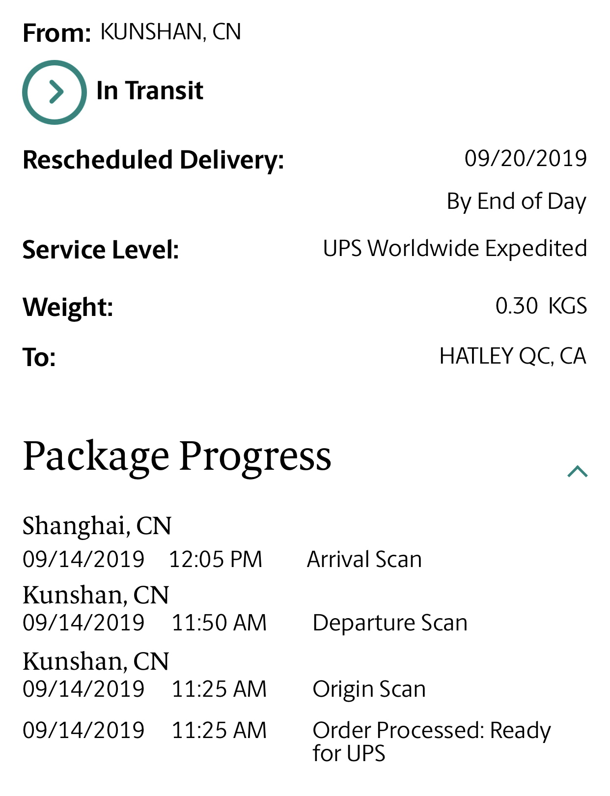 Delivery date is accurate, but the weight doesn't seem right and the destination is definitely incorrect. No idea if this is actually my phone, but I'll wait and see.
