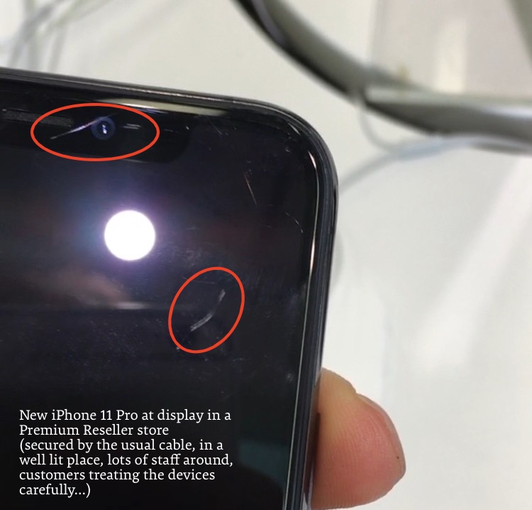I looked at several iPhone 11 Pro today in two shops (Premium resellers), and many of the iPhones I looked at had at least some small scratches. At first I thought the cover plastic is still on but they were the legit original iPhone 11 Pros. Scratches were very superficial, not deep, but definitely noticeable. Some look similar to just grease, but they are definitely permanent scratches. Staff was busy, so I just left, but a google search revealed that this might be an issue. Your experiences?