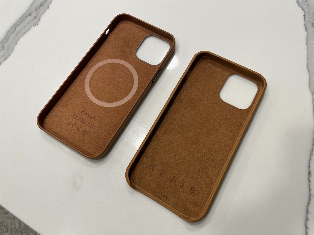 The Mujjo smells like pure leather, whereas the Apple case has a faint smell of chemicals. The Apple case completely surrounds the phone and has metal buttons that are easier to press. Other obvious distinction is lack of MagSafe magnets in the Mujjo, but the Magsafe charger still "clicks" on to the case.