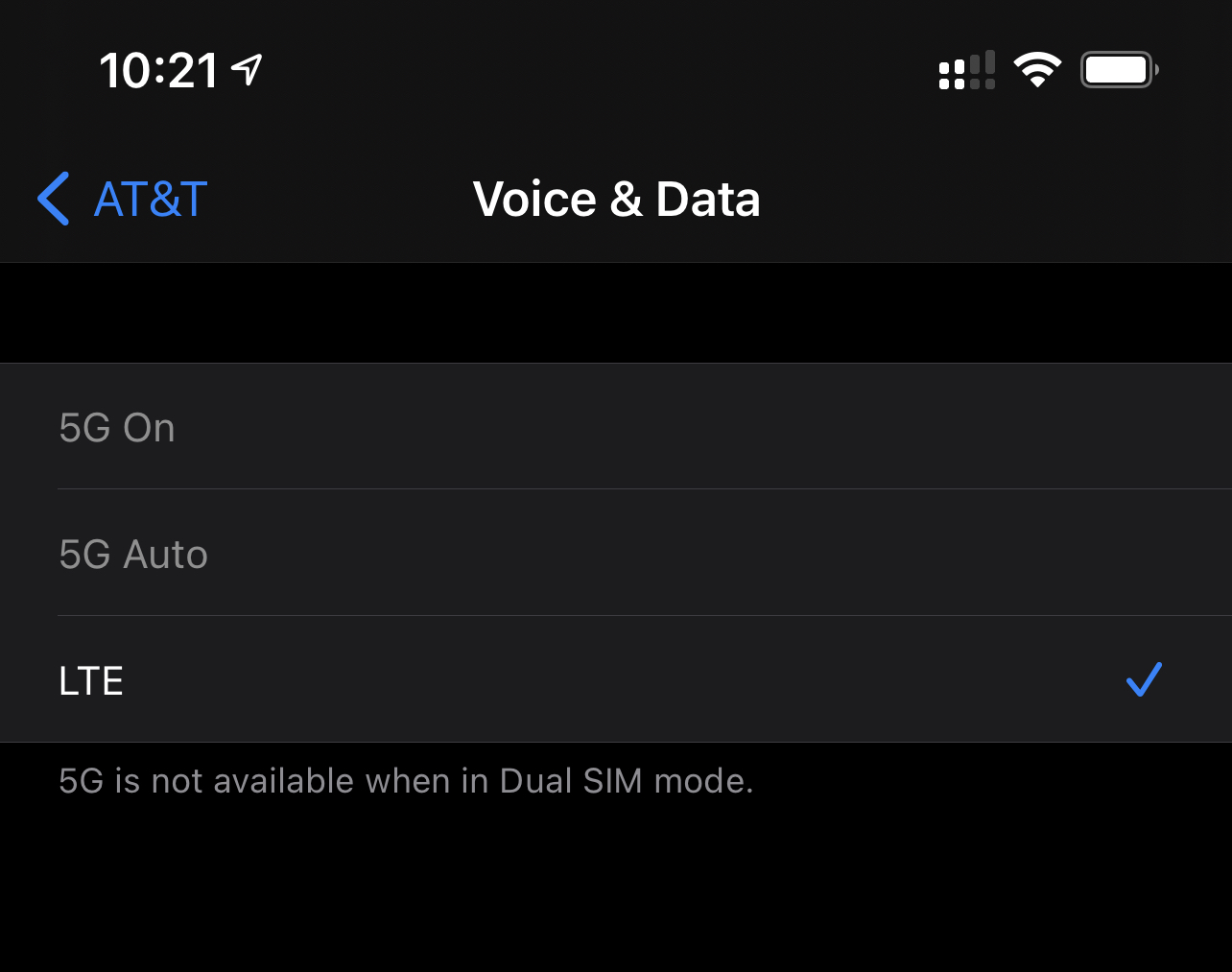 If anyone is still watching this thread this is how it looks on one line when both are switched on. iOS 14.2 12 pro max ATT. The 5G options are greyed out. If I switch off either line, the other can then do 5G