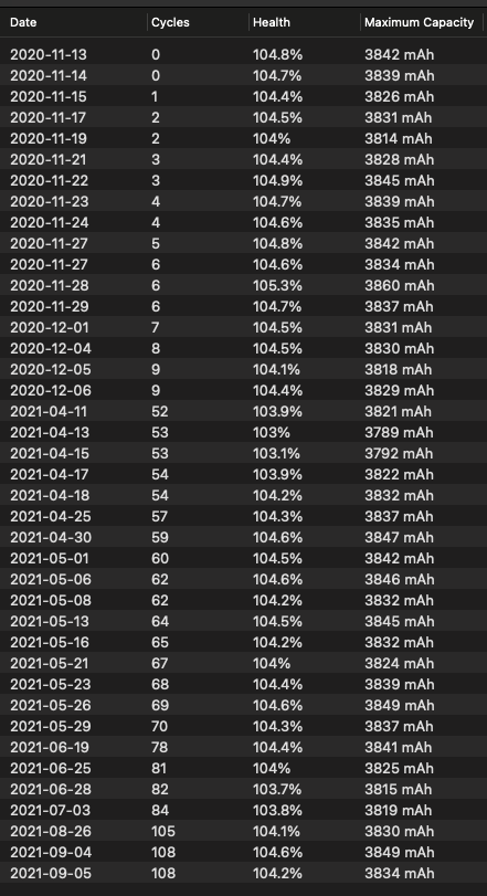 My only thoughts on this are, I've asked a few people I know who use really old iPhones as their daily drivers - hooked them up to coconutBattery and yeah, some of their capacities were down to 50-60% with thousands of cycles and they were charging all the time. My guess is that as the battery wears, you could hit a time period where it doesn't drop at all, or may drop more slowly at some points and not others.