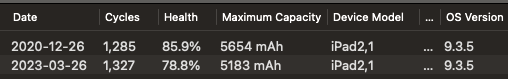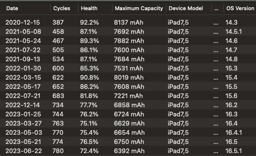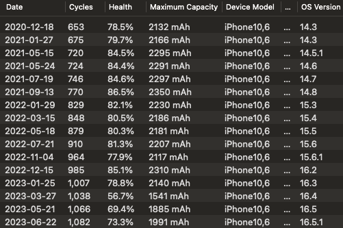 A repeated pattern I’m seeing both in phones that I’ve personally seen the results of and here, is that the heavier a user is, the better battery health is. 500 cycles equals 80% is almost never true, with users far surpassing that. I’ve personally seen an iPhone 8 with over 1700 cycles and 80% health, which is not only over three times Apple’s rating, but it would also surpass the iPad and MacBook rating (and any iPad or Mac I’ve ever seen).