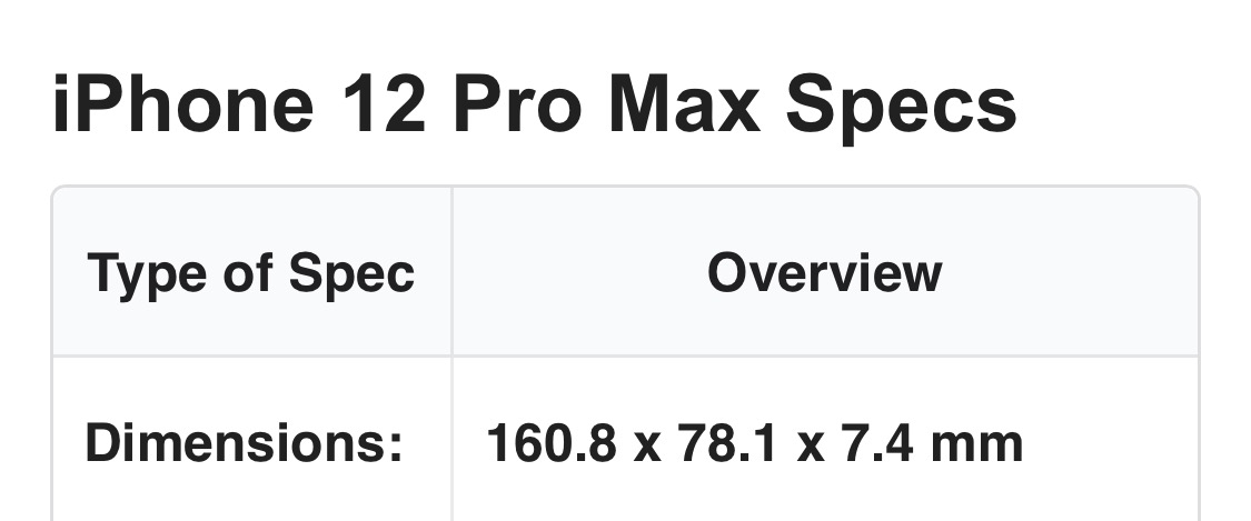 - iPhone 12 Pro Max: 4.98 in by 2.80 in = 13.94 in^2