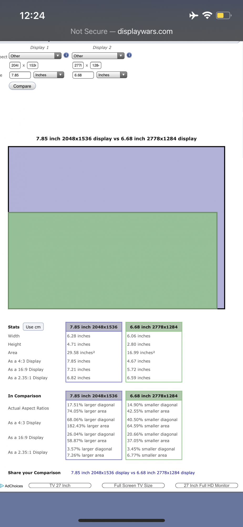 - iPad mini: 6.28 in by 3.53 in = 22.17 in^2