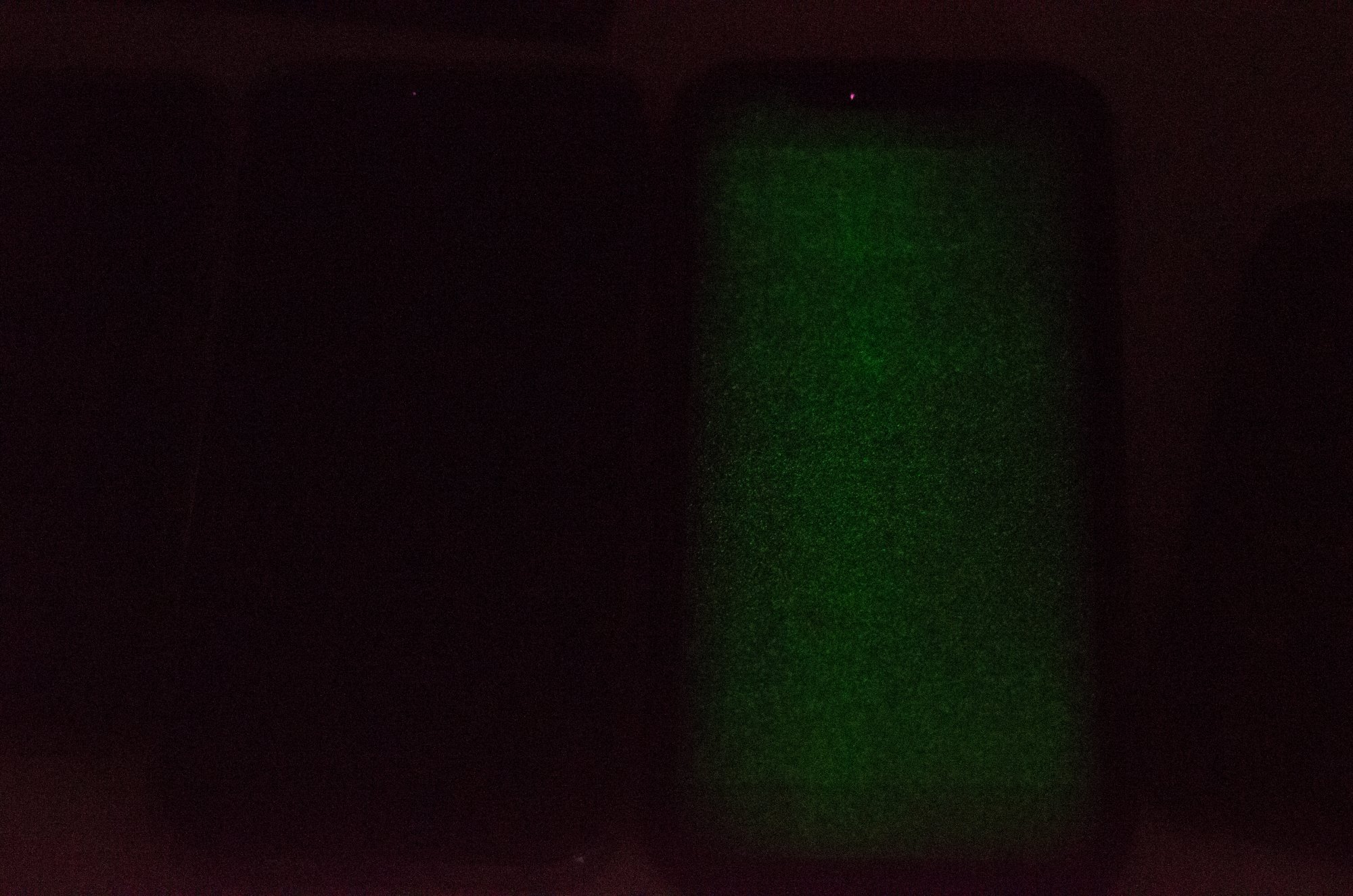 Haha no. It is pure black. Probably what ever screen you are looking This image doesn’t display amoled pure black. I have been using amoled screens for 6 years so I can tell in person. Also it was a 30 second exposure do to show the issue more clearly to Apple reps. So it will catch the faintest glow.Yes but I think in your picture the left one is still not 100% pure OLED black. On mine it is not visible like yours. Only minimalistic and I cannot catch it with a camera. Only my eyes see the grey/green glow ...