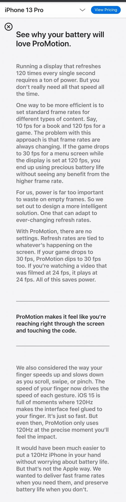 We will see. 120hrz on my S21 eats battery life worse than 5g. Even on low power mode. I am sure they use similar algorithms for the technology. I just turn it off. Not that much of a big deal. Apple disables low power mode on 120hrtz. Use my iphone 12 and S21 frequently throughout the day. Not much difference between the screens. Guarantee threads complaining about battery life. Mark my words.