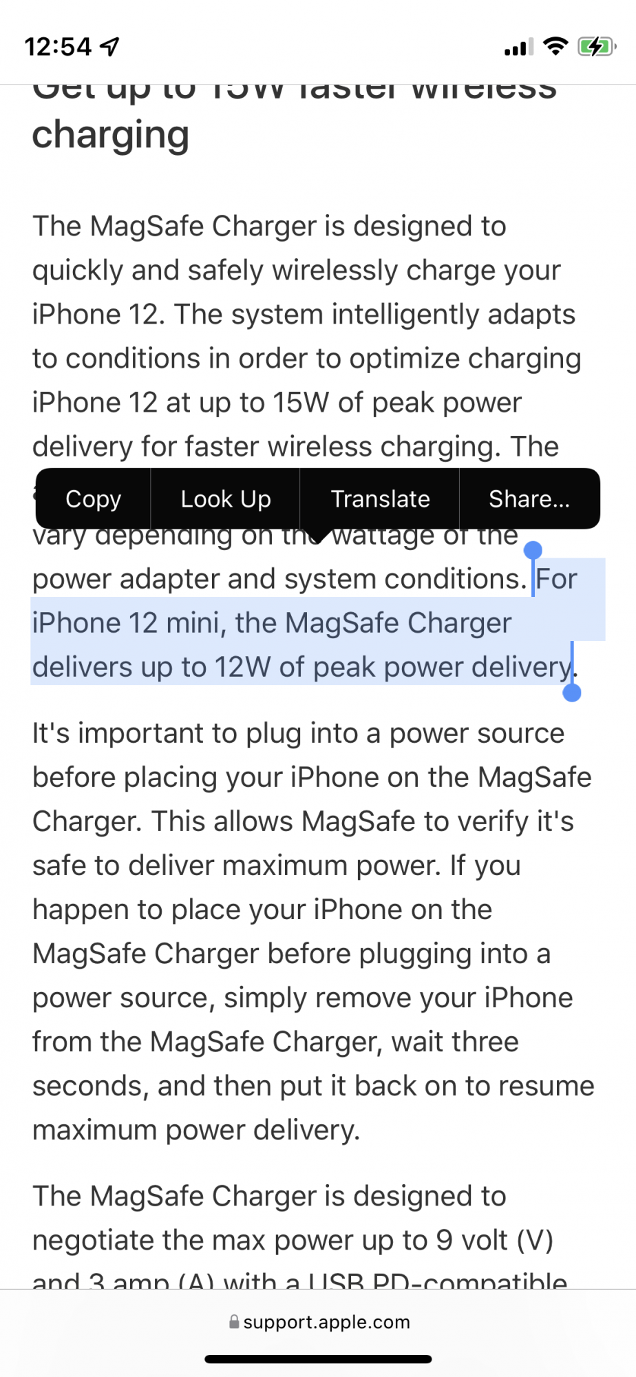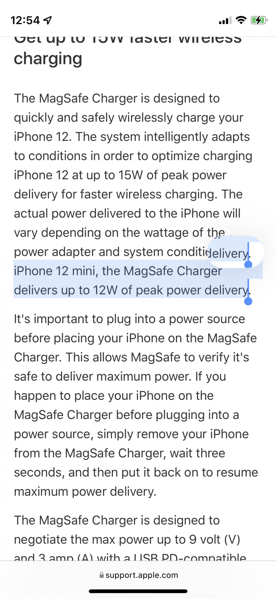 Interestingly the specs for the 12 mini still says it can wirelessly charge via MagSafe at 15W. The footnote only says “wireless chargers are sold separately”. This is both on their website and the Apple Store app. But there’s a support article from Apple saying it’s 12W. So maybe it’s the same for the 13 mini (which also says 15W).Thanks man.