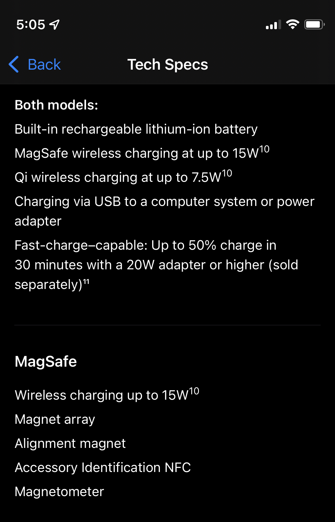The Canadian site I’m viewing doesn’t say that. Plus the page screenshot is cropped so can’t agree you’re actually looking at the iPhone 12 mini here.Interestingly the specs for the 12 mini still says it can wirelessly charge via MagSafe at 15W. The footnote only says “wireless chargers are sold separately”. This is both on their website and the Apple Store app. But there’s a support article from Apple saying it’s 12W. So maybe it’s the same for the 13 mini (which also says 15W).