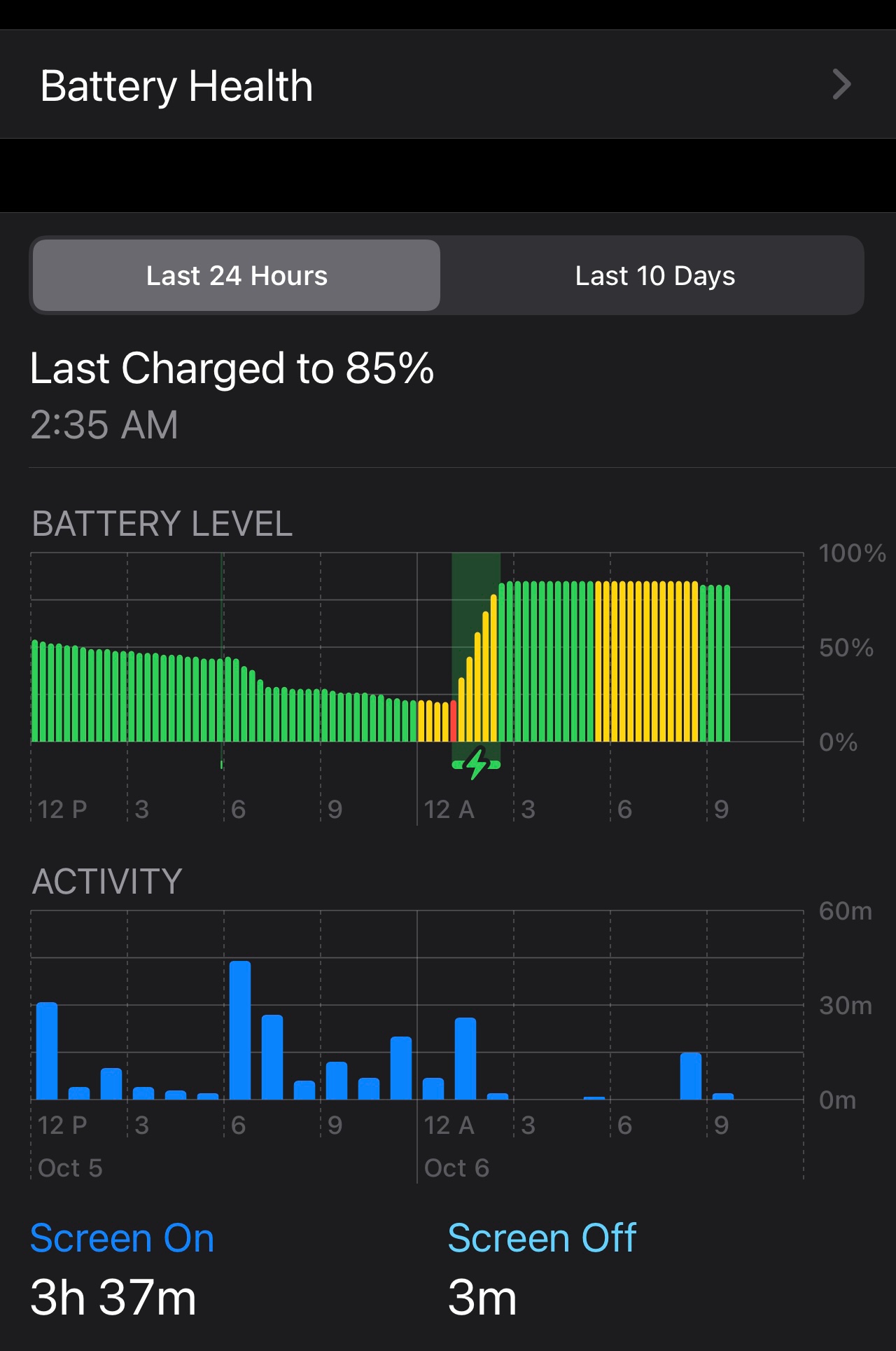 The Screen On time and Screen Off time reported on the 24 hr chart may not be accurate. In my case, the graph is reporting 4 hr 16m. However, when I manually calculated each bar entry, I get a total of 3 hrs Screen On time.