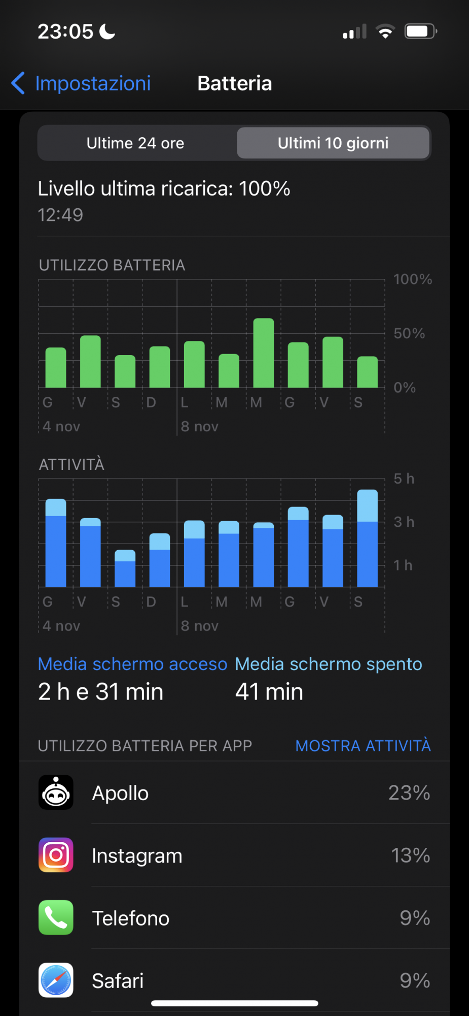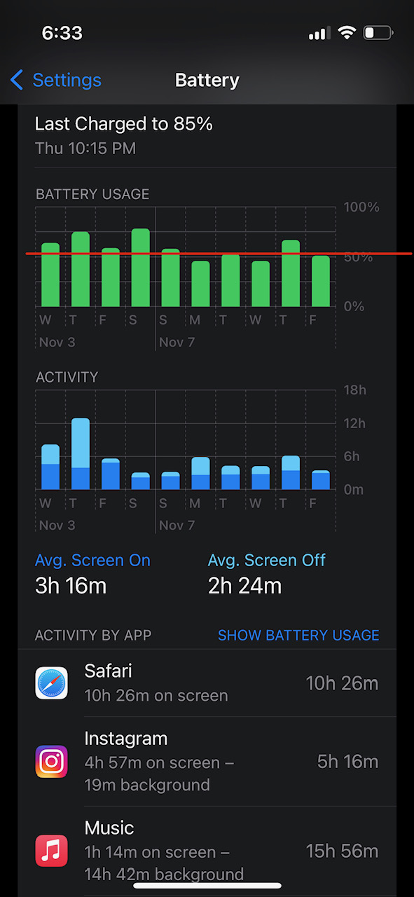 The second image shows what the 10 day average is for screen on, and the red line marks just above the 50% mark, so with 3hr15min SOT, it makes sense that a not completely accurate visual average of all the green bars is around 50%.