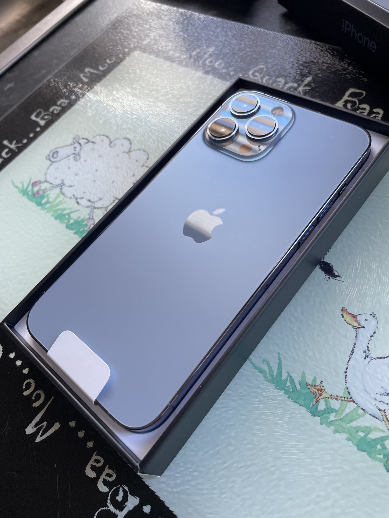 Here's my 128 GB Sierra Blue 13 Pro Max. Pardon the chopping board it's laid on - I was in the kitchen when I unboxed it. It's the least dusty room of the house, and I wanted to try putting the screen protectors on the moment I got it out the box (which was an epic fail because I suck at it).