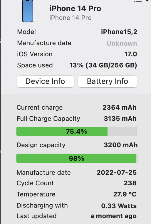 I am hoping it’s down to the iOS 17 beta as a lot of people that have seen a drop in their battery health do seem to be running ios17 at the moment. 🙈I don’t own an iPhone 14 Pro, do have an iPhone 11 Pro Max at 82% but I wanted to say that it’s interesting before this forum post; though out the year I was picking up that the iPhone 14 Pro was having battery longevity issues. I honestly think this is a real issue. I wouldn’t be happy purchasing one of these units.. Really hope Apple releases a 5000mah battery and catches up with the other phone makers. Or even better one of those new higher density 5200mah batteries idk which newer tech that was all about. Is this simply Apple cheaping out?