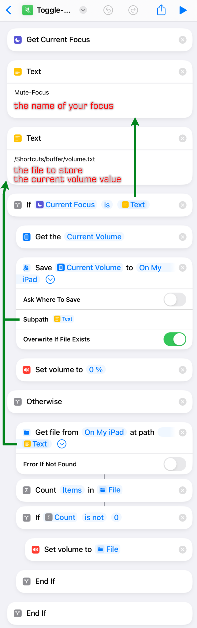 Depending if the Focus gets activated or deactivated, the Shortcut mutes or restores the system volume.
