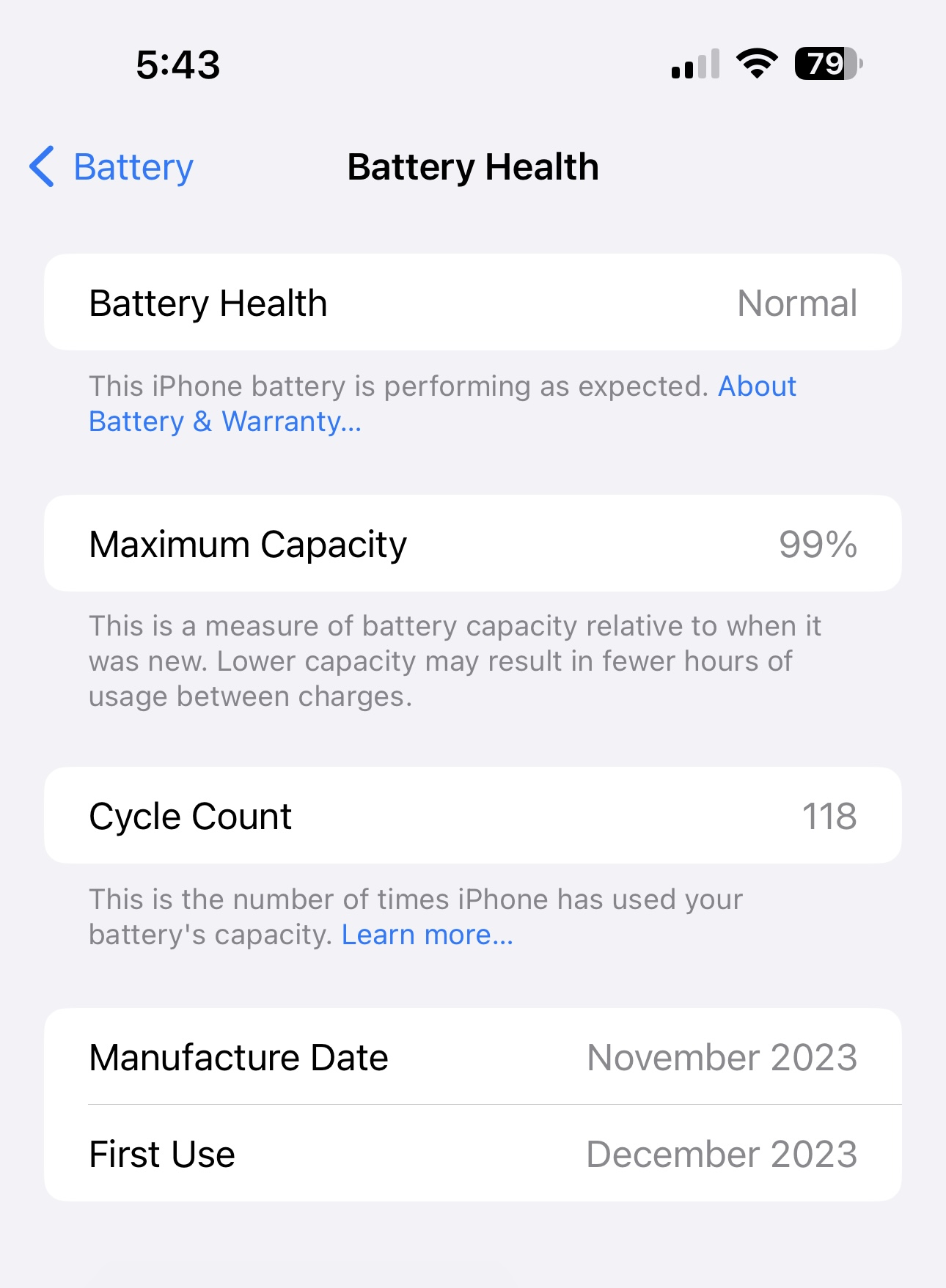 View attachment 2393824Well, it just dropped today. I finally hit 99%. I have only charged this phone with an Apple 20 watt charger. No MagSafe charging. Only 118 cycles, I guess I’m a little disappointed but I mean it’s still 99%.