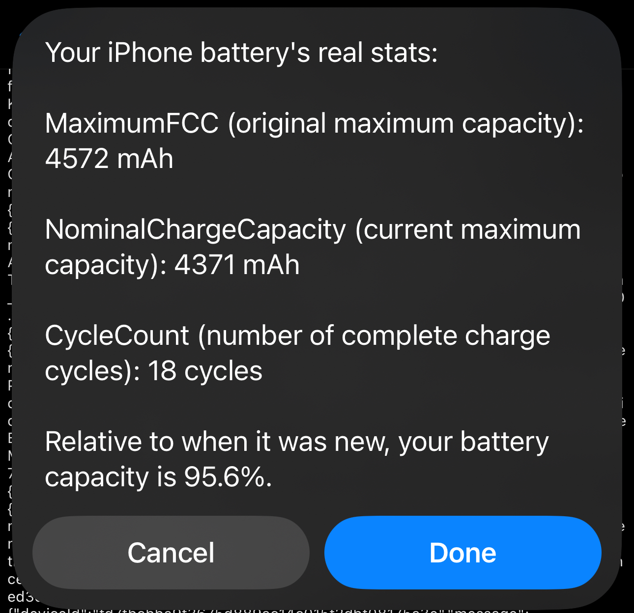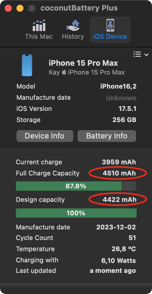 New last month 15PM showing a drop of over 4% after 18 cycles in real battery stats.