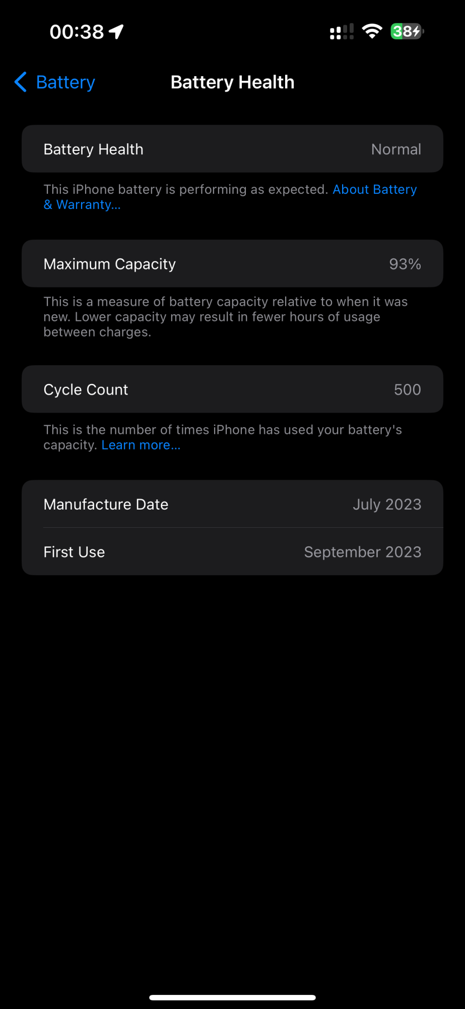 I’m at 88% at 329 charge cycles, and mine is a launch day 15PM.What is everyones iPhone 15 Pro Max Maximum Battery Capicity at? My iPhone is from a day 1 launch and it's at 93% maximum capacity after 240 cycles. I have had the charging optimization on the whole time so I'm not sure if 7% battery degradation is normal or not.