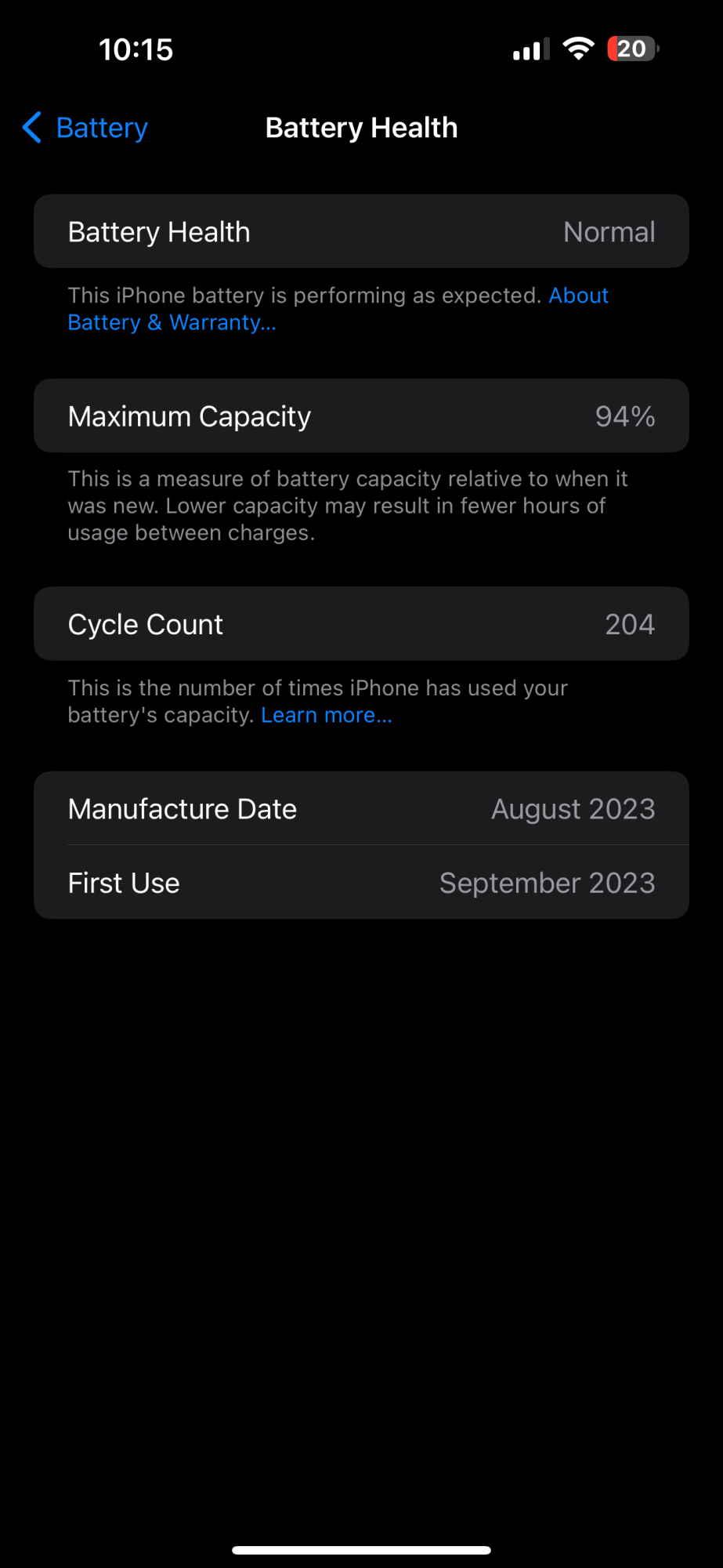 I have a launch day 15PM with 328 cycles and 88% battery life. I have optimized charging enabled, but I use my iPhone to listen to music at work with my AirPods, browse social media, text and talk until I get home from work, and then I use my iPad Mini 6. I do use a Mophie 45W charging brick at night to charge, so I blame that and charging before getting off work everyday for the degradation of my battery. I’m keeping mine for another year as well, and will be getting a battery replacement at 80%.Launch day 15 pro max. Just dropped down to 94% today. I don’t use fast charging and have optimized charging. Slightly disappointed in the 15 Pro Max battery considering my 14 pro max was still sitting at 98 or 97% around this time last year. I feel like the 15 pro max battery degradation is much faster than previous iPhone models for whatever reason.