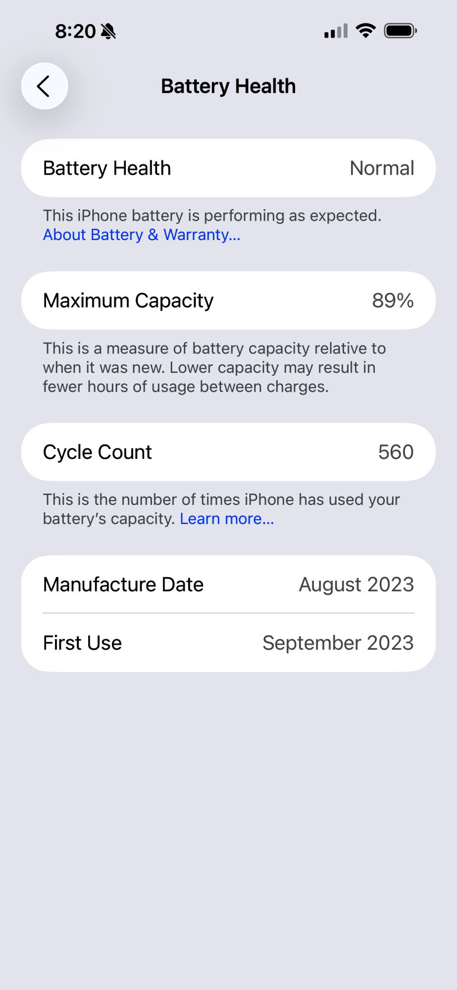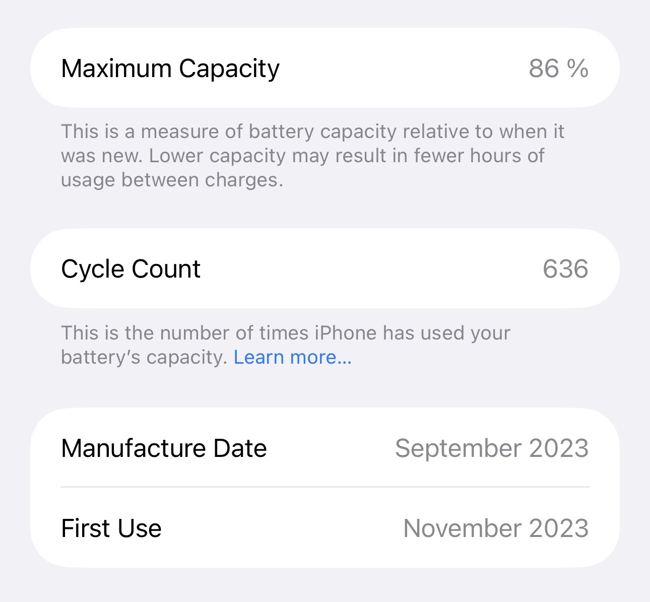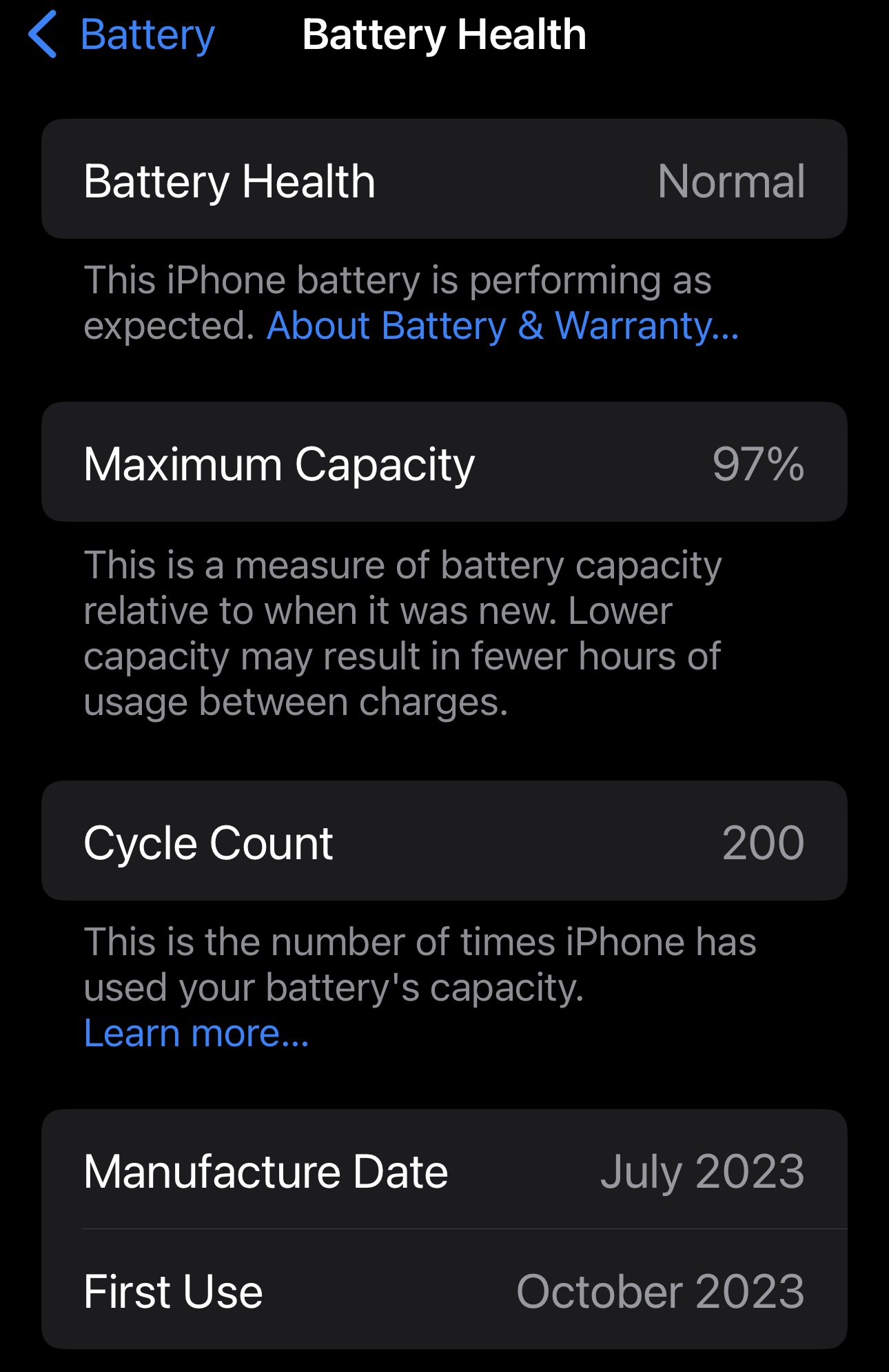 A bad battery from the start? I didn't even know you could have such differences in battery performanceAnother member has 846 charging cycles. I’m at 746 cycles with 81%. I run it down to 0% and charge it back to 100%. I’m charging it twice a day now. I just have a bad battery.