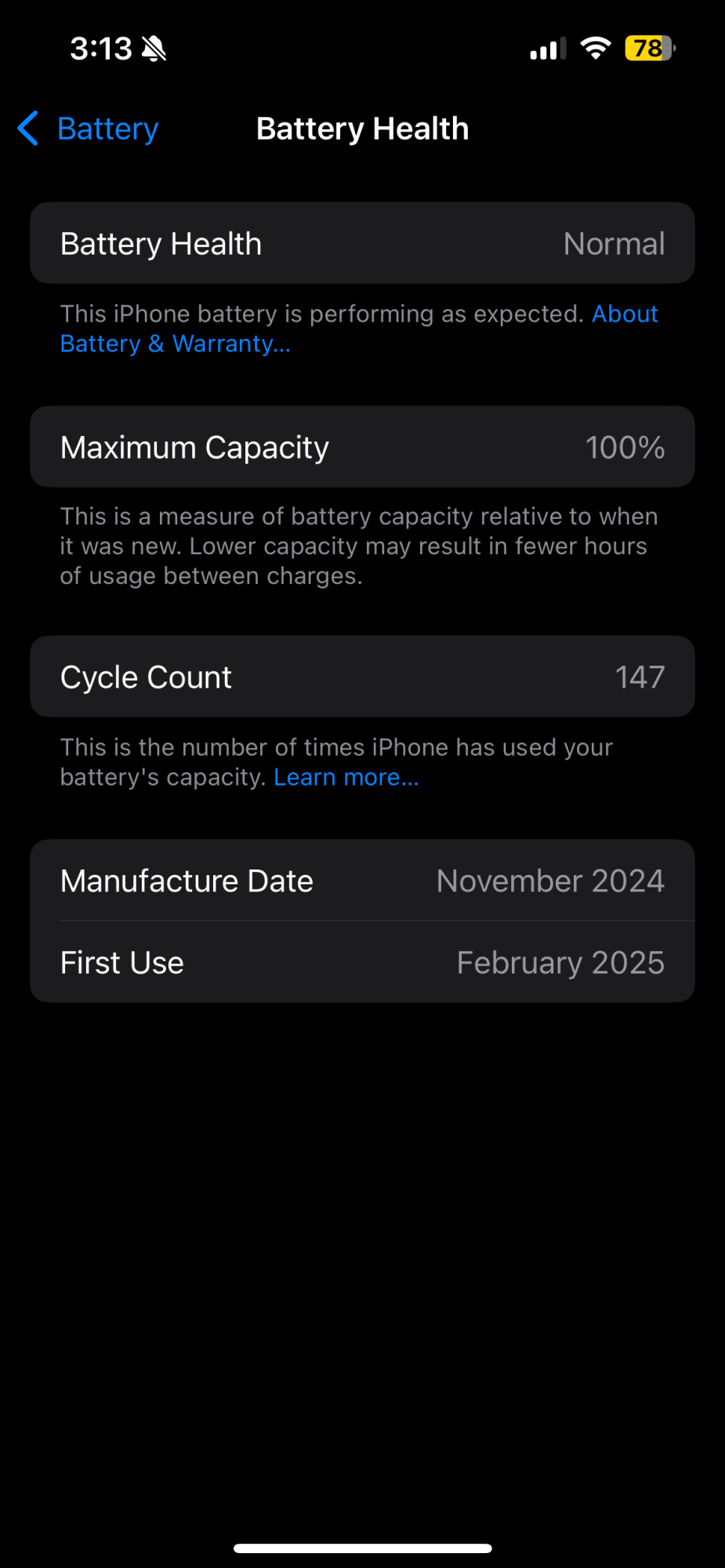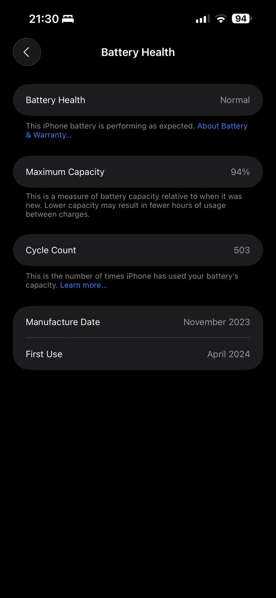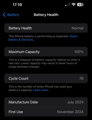 Did you buy this new? Interesting you were able to buy it Nov 2024, after the iPhone 16s had already come out... Very few cycles in 10mos!Here's the battery health for my iPhone 15 Pro Max, purchased November 2024.