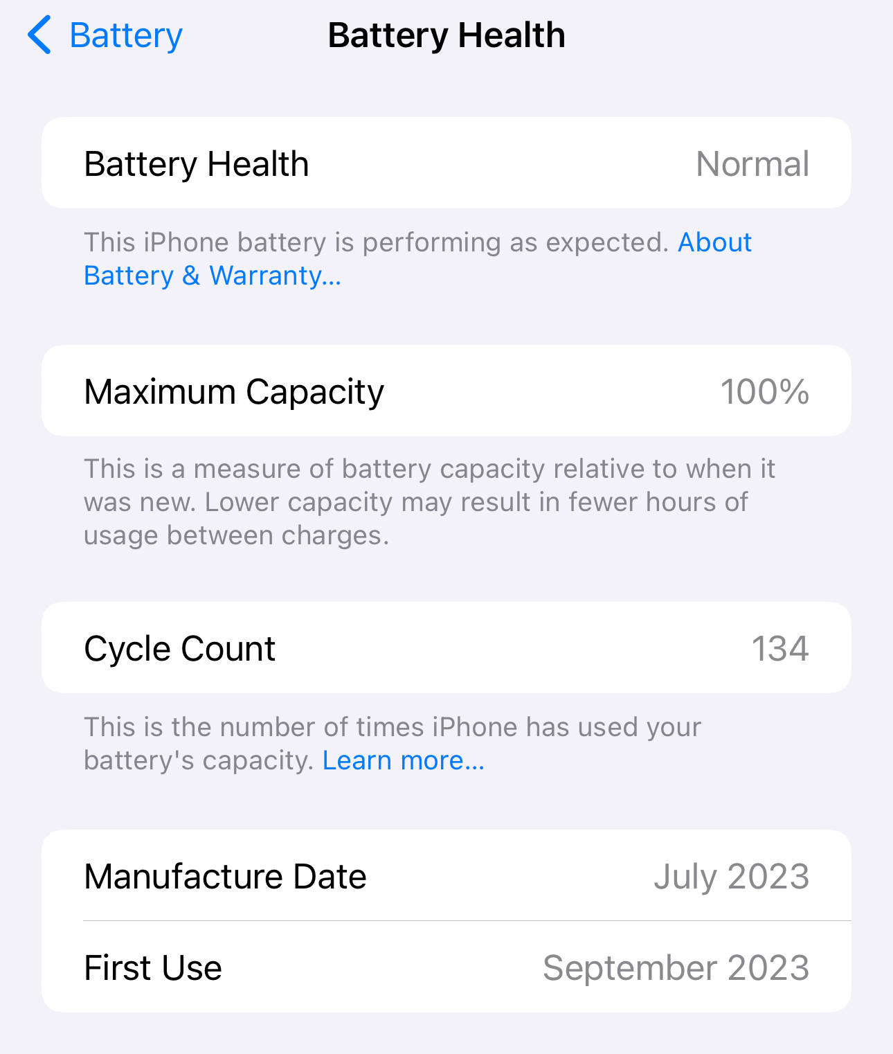 I’ll give an example: My iPhone Xʀ (that is on iOS 12 and that is my main phone), is at around 270 cycles with 93% health. Decent per Apple’s claims, but if you see some examples here, it’s not that amazing. An iPhone 8 I’ve seen, after 4 years of heavy usage, had 83% health after 1800 cycles. One has a high cycles-to-time ratio, the other one doesn’t.