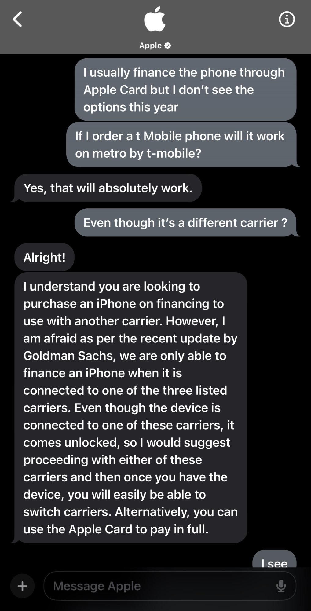 Hmm interesting. I wonder what they mean by “easily able to switch”. Do they mean immediately activate on carrier or our choice upon unboxing? Or sign up with the carrier we selected online, then switch after a month?View attachment 2262303This is what the last agent told me
