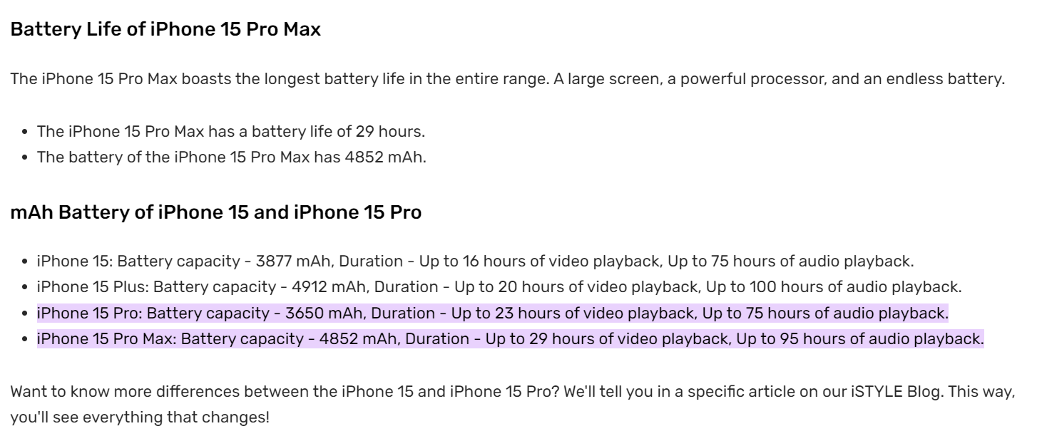 This got posted today (https://istyle.ae/blog/how-much-battery-does-the-iphone-15-and-iphone-15-pro-have#:~:text=iPhone 15 Pro: Battery capacity,95 hours of audio playback.), hopefully it's true.
