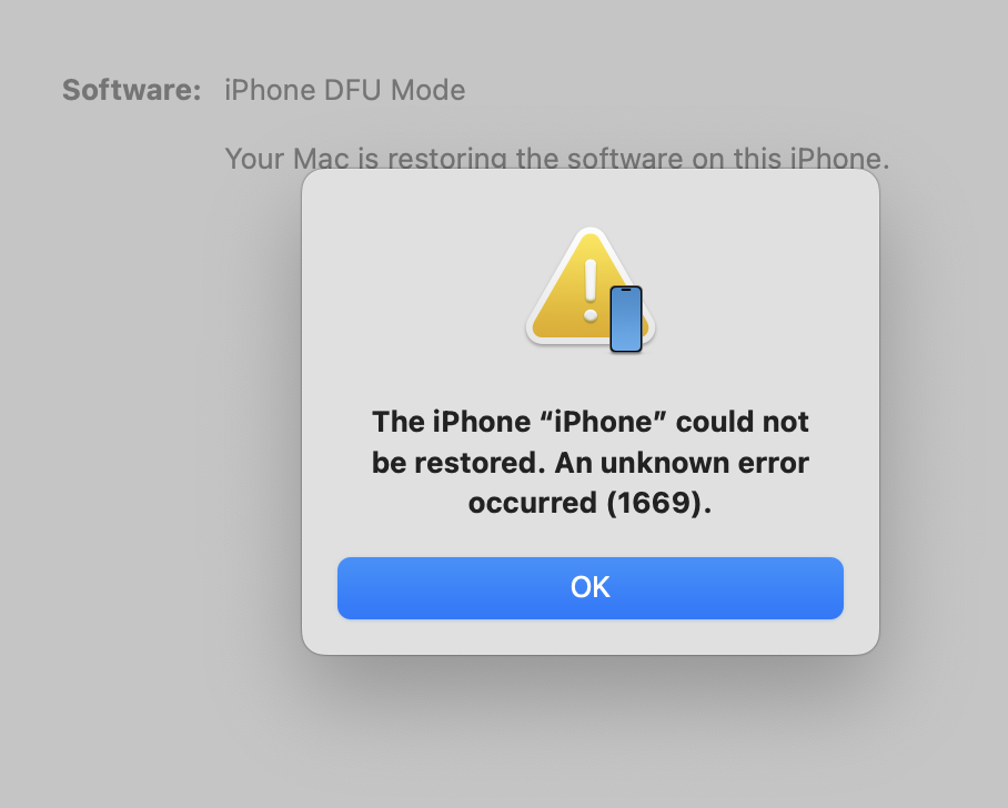 I am testing this iPhone and usually whenever a newer update is available than out of the box, I perform a dfu restore to have the cleanest system possible. With this iPhone I get an error (1669) during the start of recovery phase.